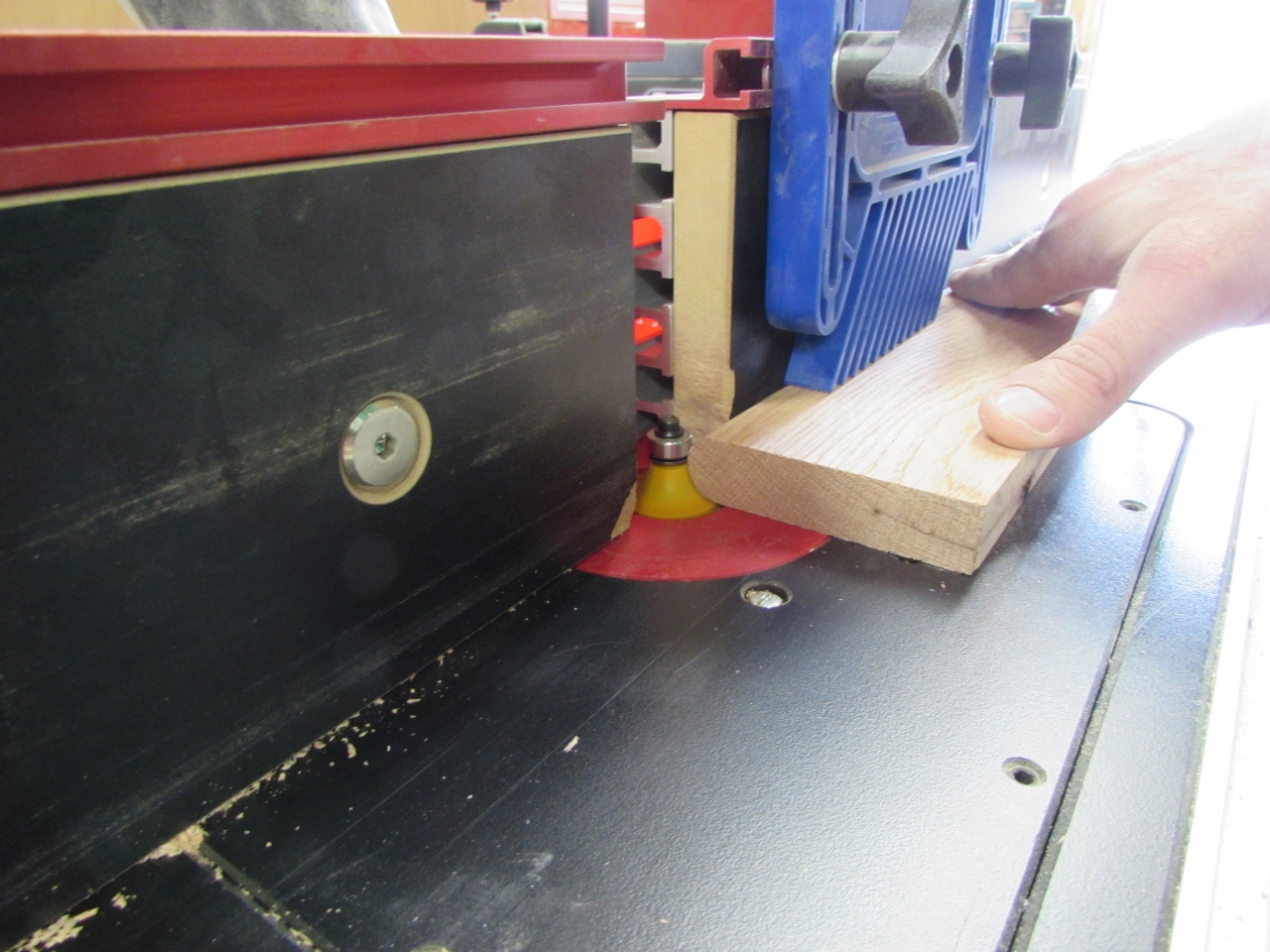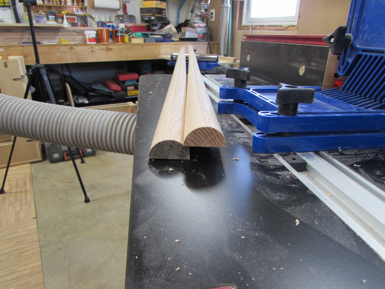 I put my 3/4″ round-over bit in the router table and ran the other half of my strips through twice, cutting a 1/4 radius each time to create a half-round piece of trim.