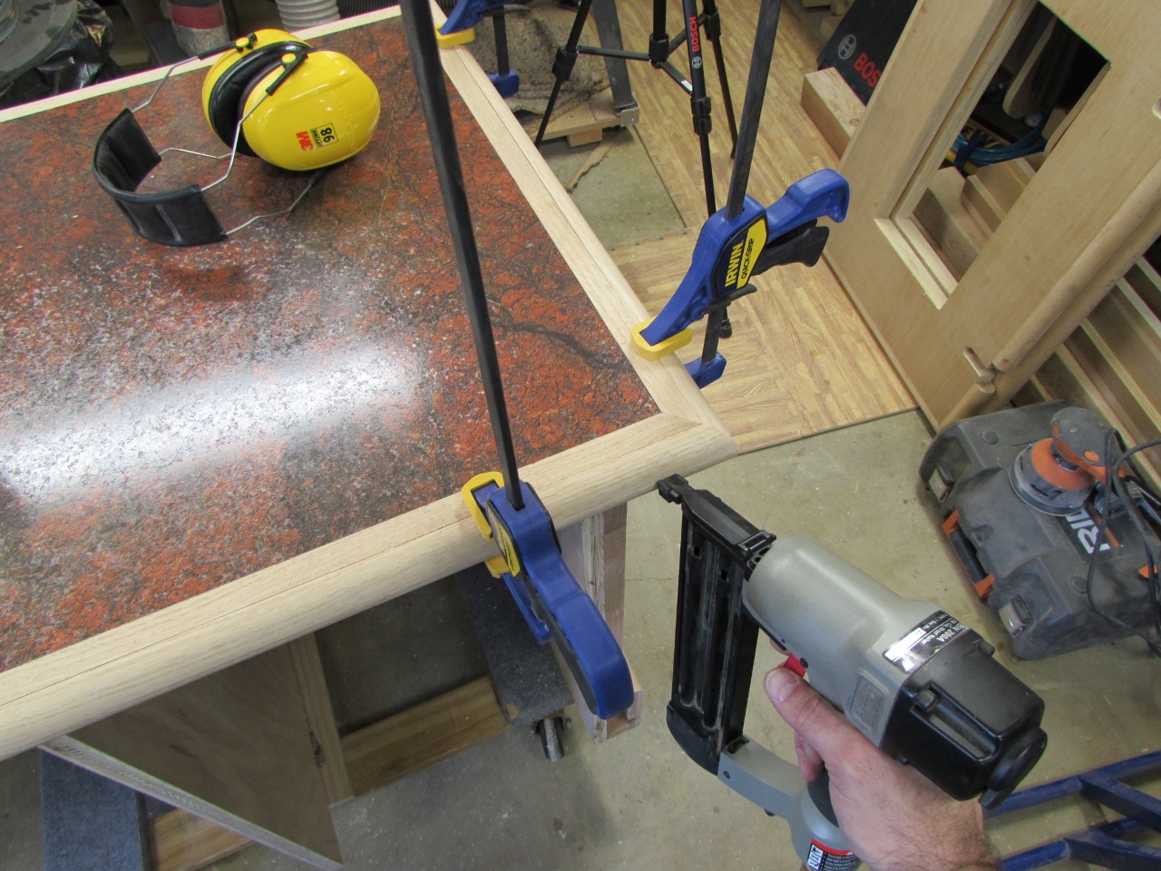 With the top in place and drying, I started cutting some 1-1/2″ wide strips of clear oak to band the edge of the counter top. I cut enough to wrap the top twice. You will see why in a bit.