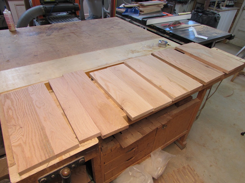 I set the counter top aside for a bit to cut and glue up the boards that will become the shelves and supports under the solid oak counter top. I started by matching grain direction and trying to line up the patterns in the grain.
