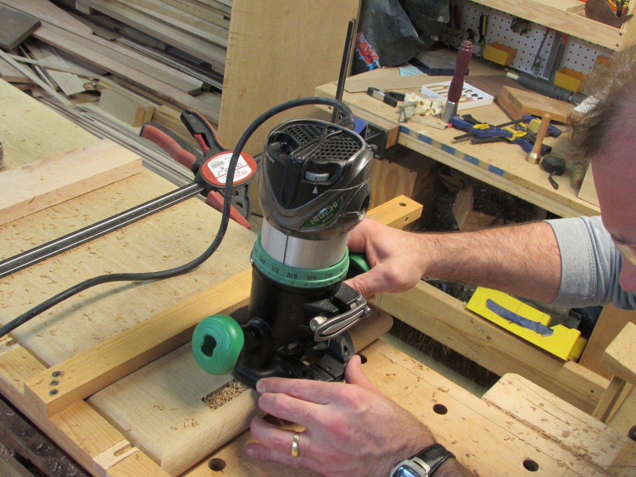 This locates my cut perfectly in line with the edge of my dado. I made three passes with the 1/4″ router bit to create the dado, then cleaned up the bottom of the dado and squared up the ends with a chisel.