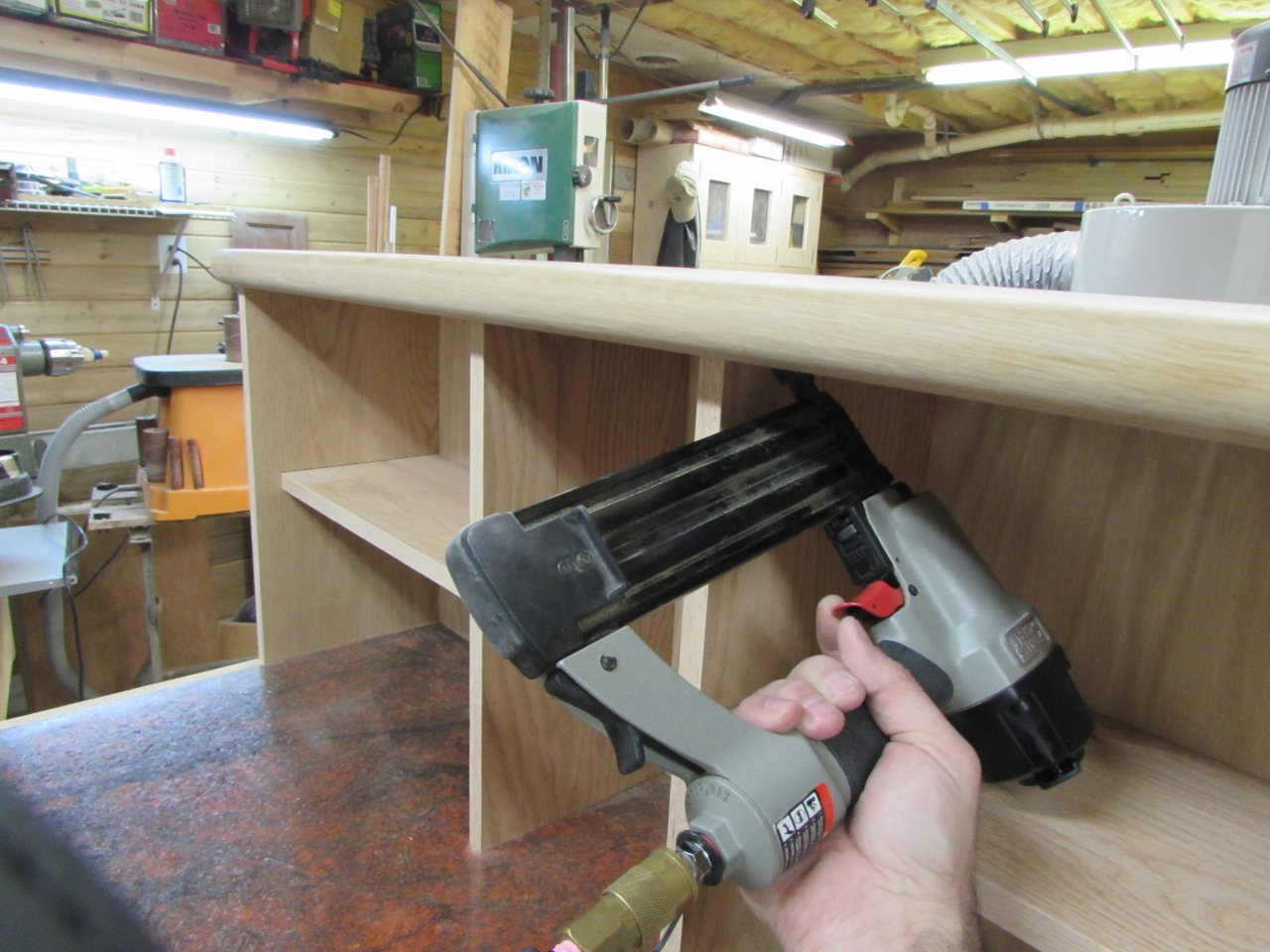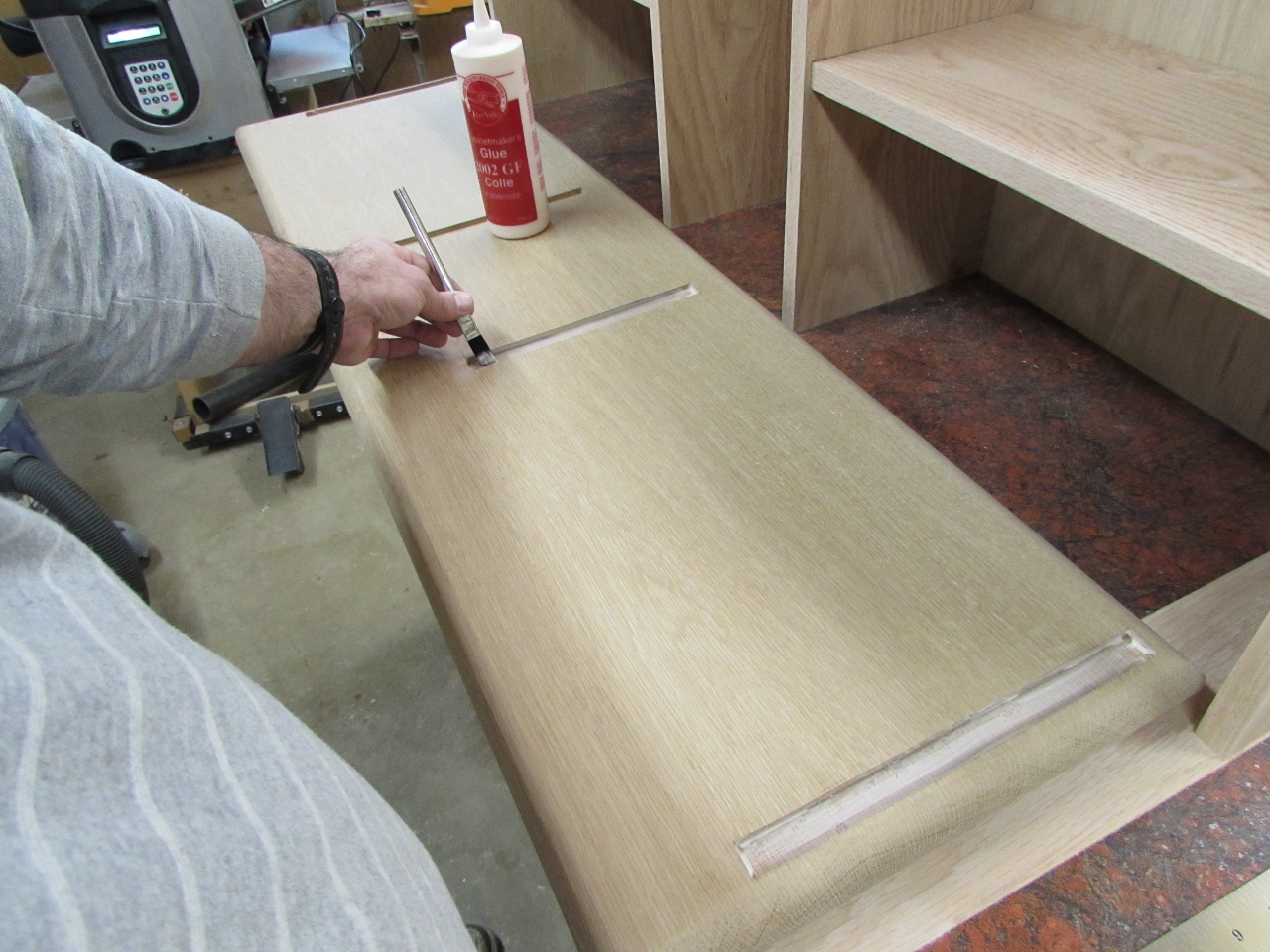 I applied glue to the inside of the grooves with a stiff brush, then flipped the counter top over and pressed it into place. I used my brad nailer to toe-nail the vertical panels to the shelf, to hold it while the glue dries.
