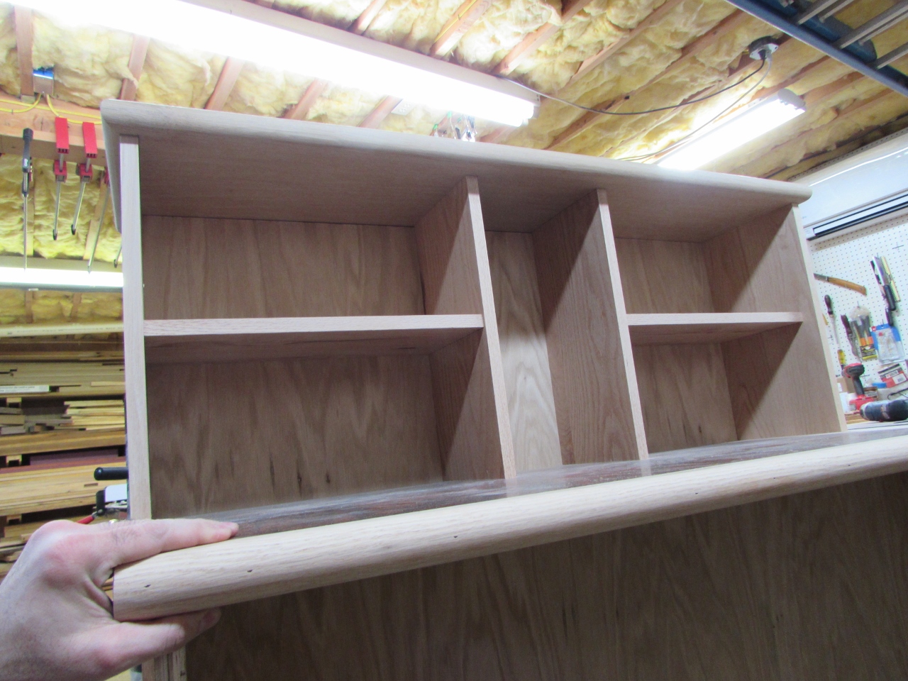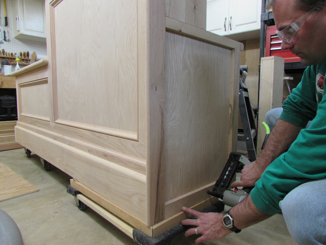 Before trimming the cabinet area, I created a 1-3/4″ base at the bottom, then placed a piece of 3/4″ oak plywood on top of it.