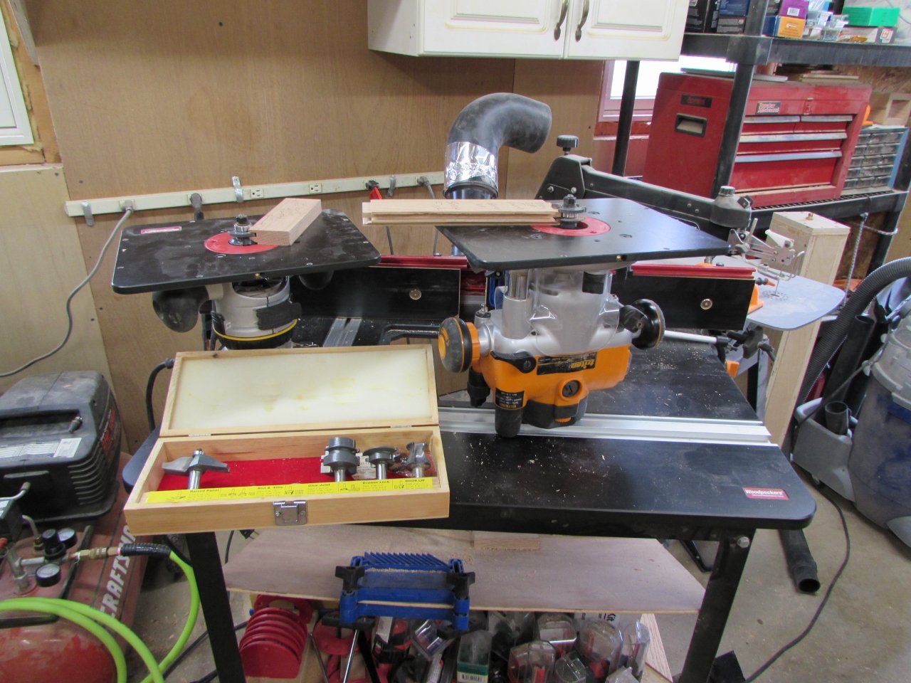 While that was drying, I cut and planed down the wood for the frame of the door. I have set-up blocks for my rail and stile router bits, that I made on a previous project. I used these to set up two different routers with the bits.