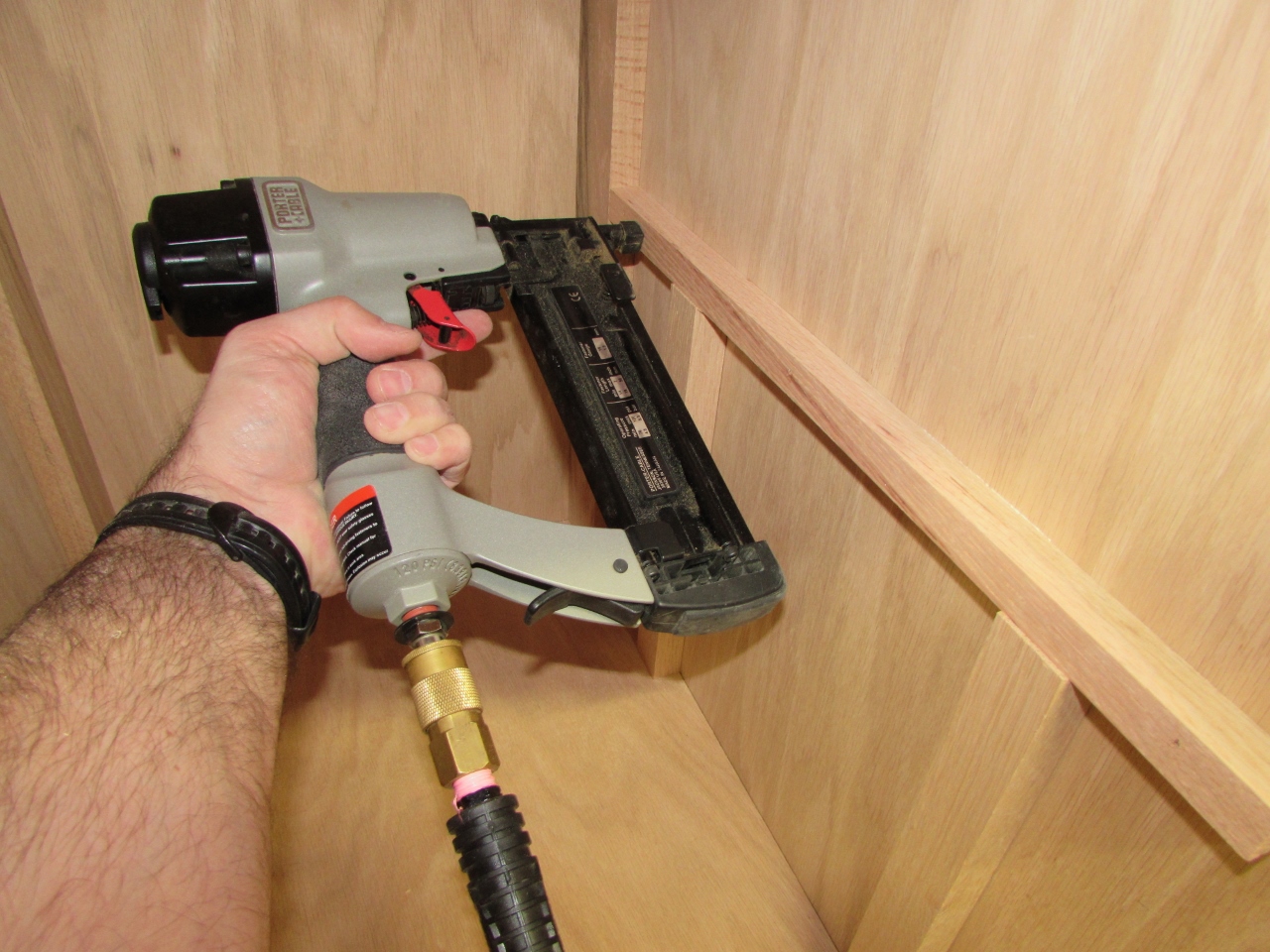 I applied a bit of glue to the top of each rail, then nailed the shelf in place.
