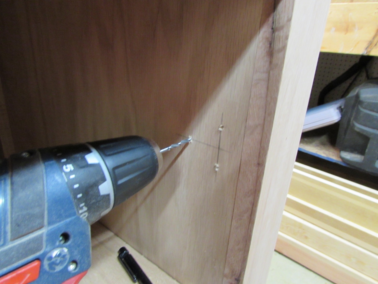 Once I had the layout, I drilled the large holes in the door panels, then laid out the other side on the inside of the cabinet.