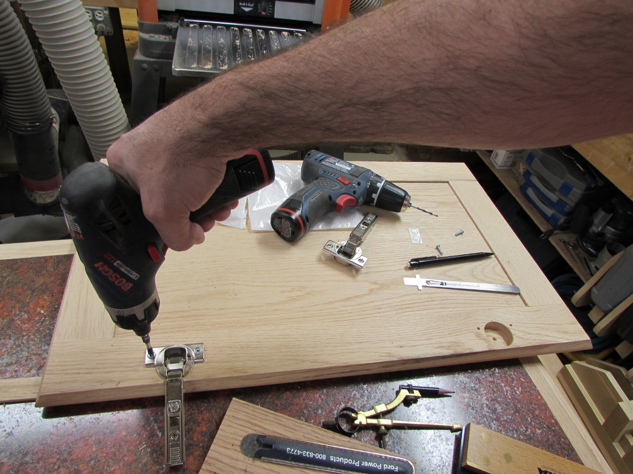 I like the versatility of the European style hinges. They are very strong, but also adjustable. You can also get them with different features. These open only to 110 degrees, which will prevent the door from swinging open past the side of the desk, where people could run into it. It also has a soft closing option that will hold it closed, preventing the need for a magnetic catch. The instructions are always in metric, so I take my time figuring out the layout. I always make a test piece before making a single mark on my project. As you can see from the test piece, my first hole was not where it should have been…