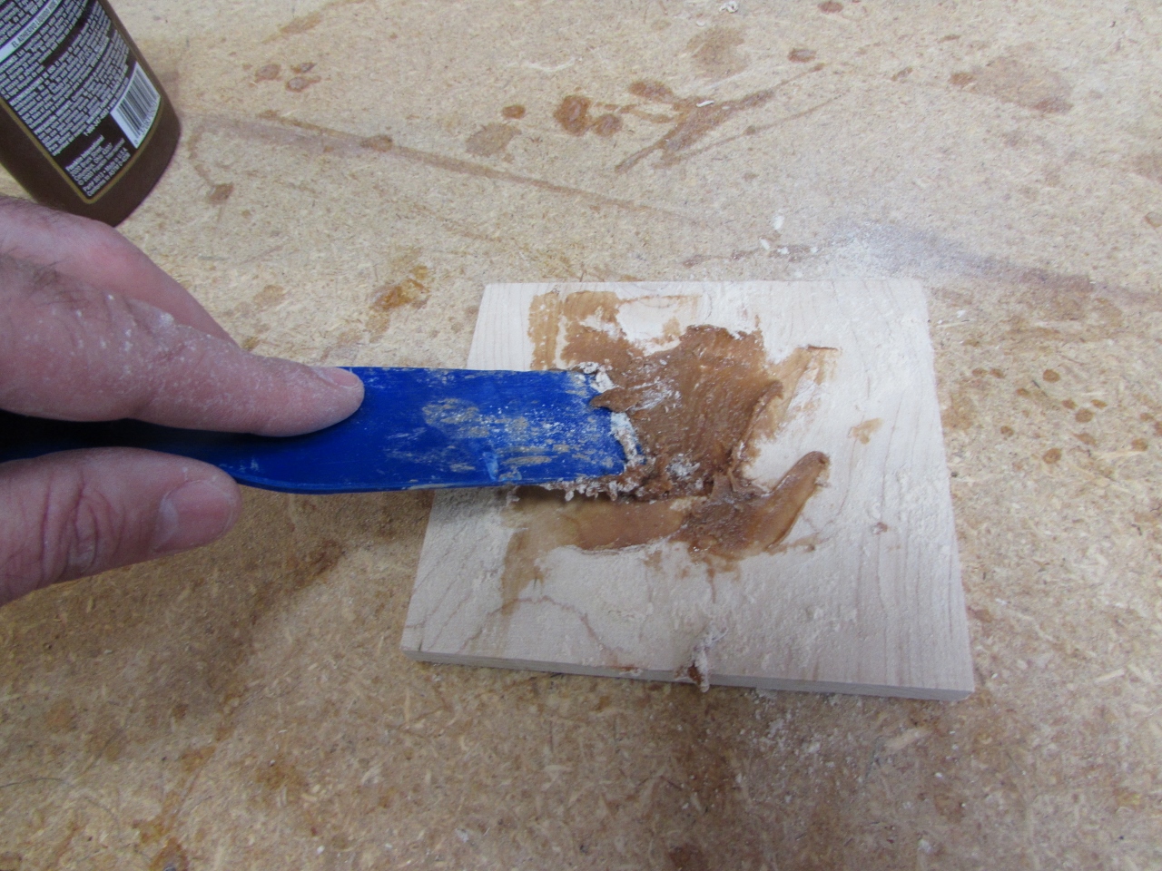 Most wood glues fill the pores of the wood and create a barrier that prevents stain from adhering properly, even with sanding. Hide glue does not create that barrier, so I mix hide glue with the wood flour to create a paste. It makes the filler a lot darker than the wood, but I am staining this project, so it will be fine. If I were not staining it, I would use shellac instead of the hide glue, so the color would be lighter.