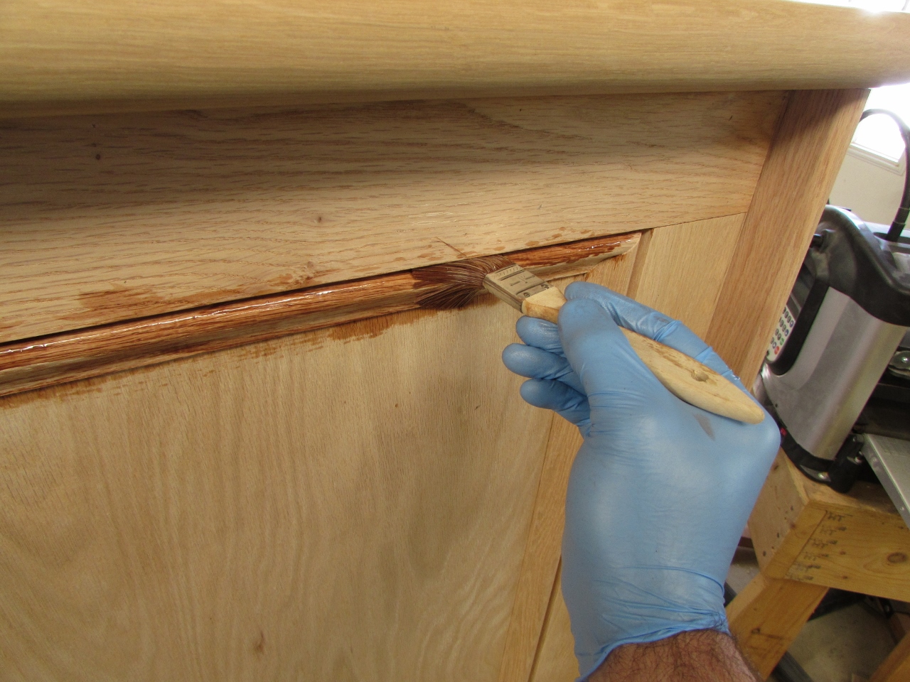 I used a small disposable brush to cram into the tight corners and spread the stain where the rag couldn’t reach. The rag, that I am using, is just a piece from an old tee-shirt. It has been sufficiently worn out so it is mostly lint-free at this point.
