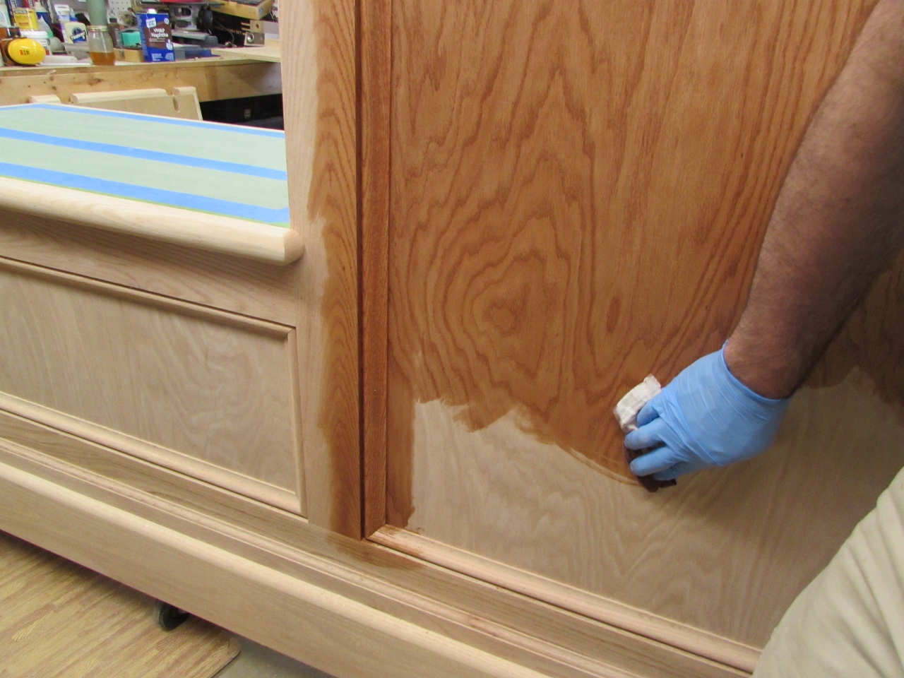 After sanding, I stained the door panel first, then moved over to the front of the desk.