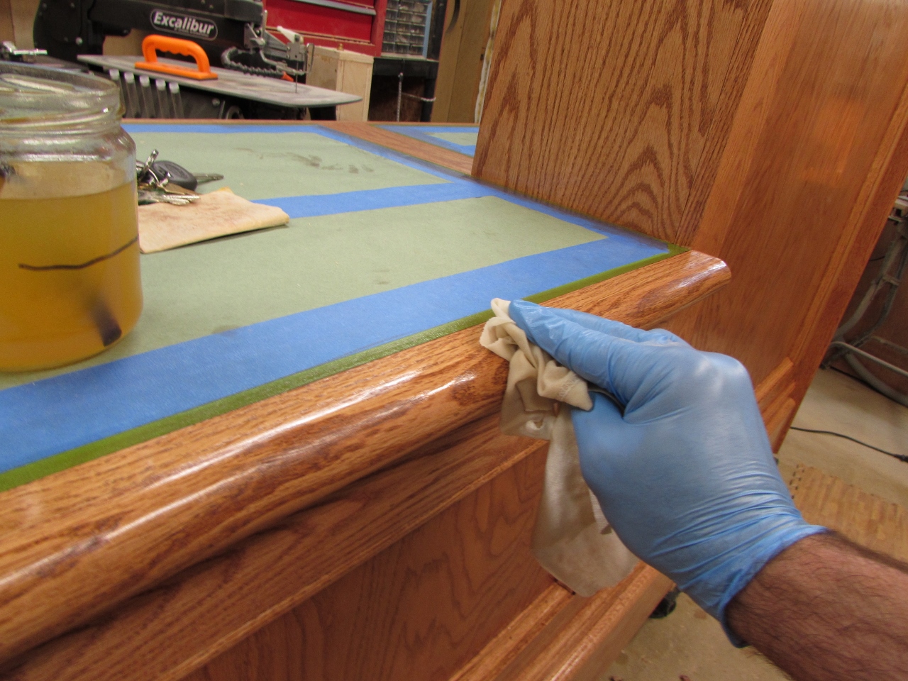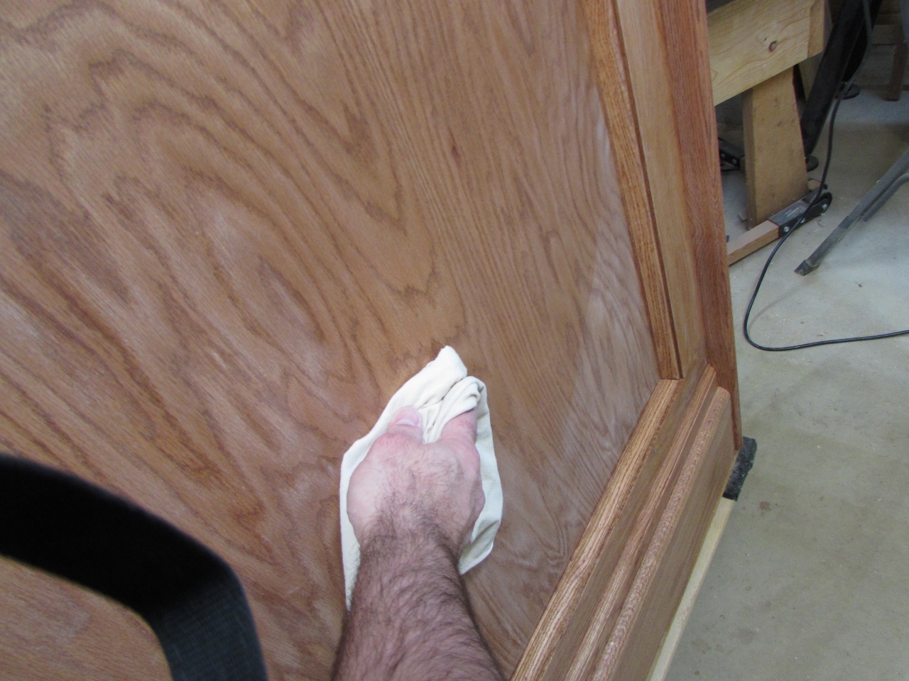 The sanding removes any dust nibs or raised grain. The grain of the plywood has a tendency to raise up more, than the solid wood, when the finish is first applied. A light sanding assures that all of the surfaces feel equally smooth. I use an old tee-shirt to wipe away the dust, and I turned on my room filter to try to keep the dust from floating around and landing back on the wet surfaces.