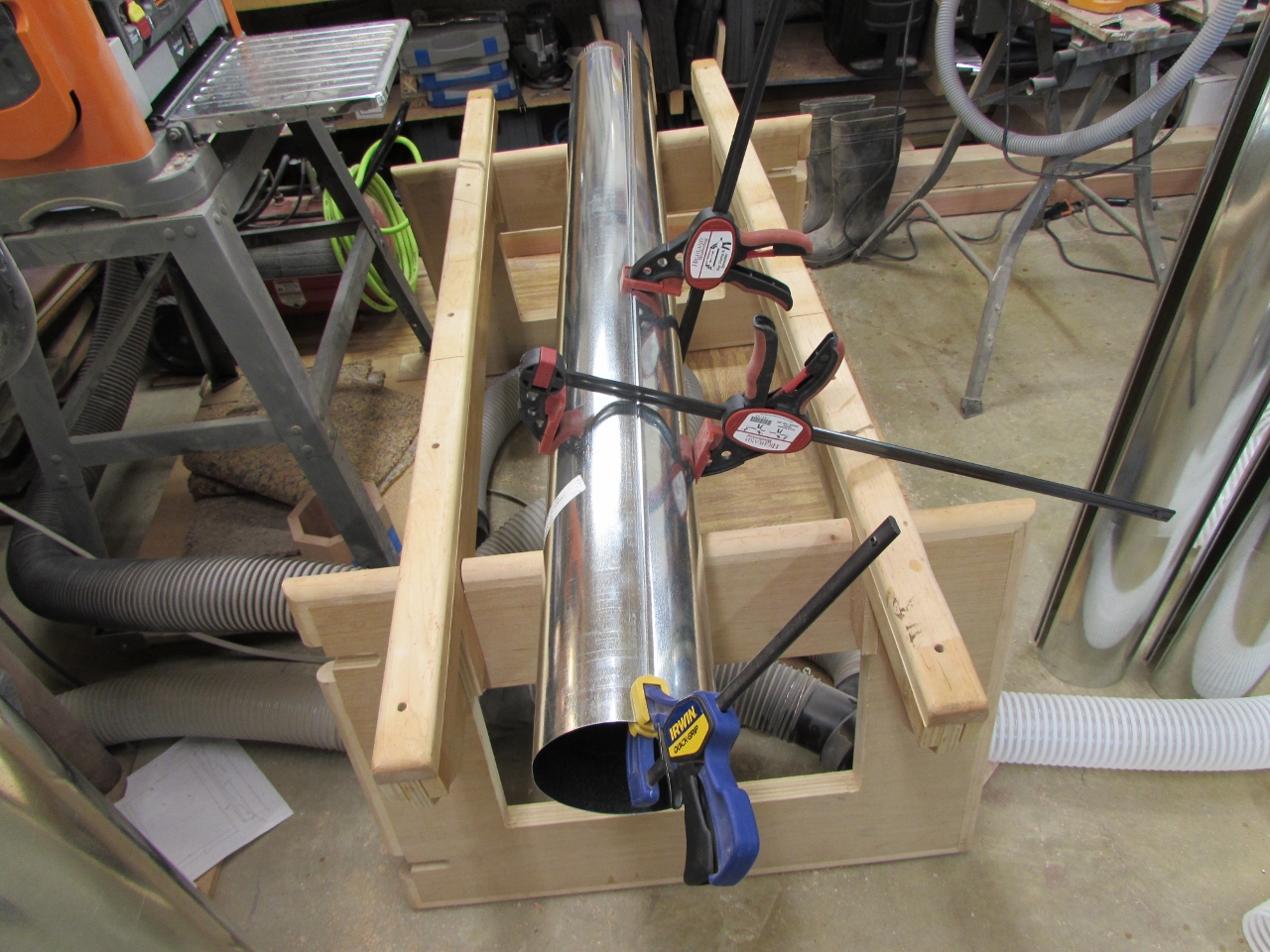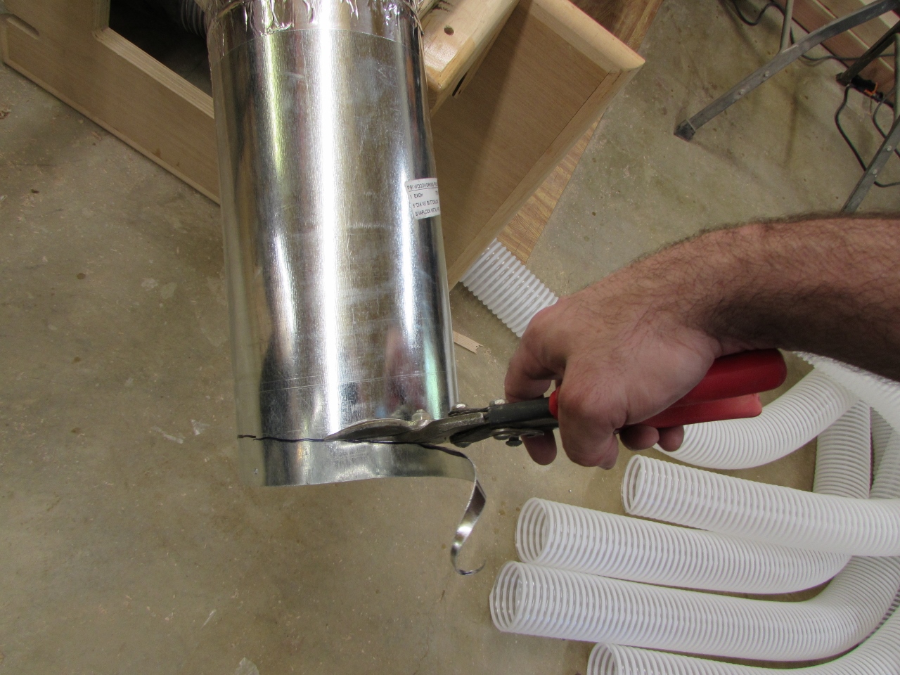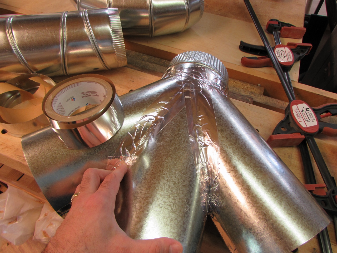 Snapping the straight duct runs together was anything but a snap. Penn State recommended two people for the job. The pipe was so stiff that I required two or three clamps to do it. One to hold the start of the connection, at the end. One to pull the duct together, and one to squeeze down so I could work my way down the pipe snapping it in place.