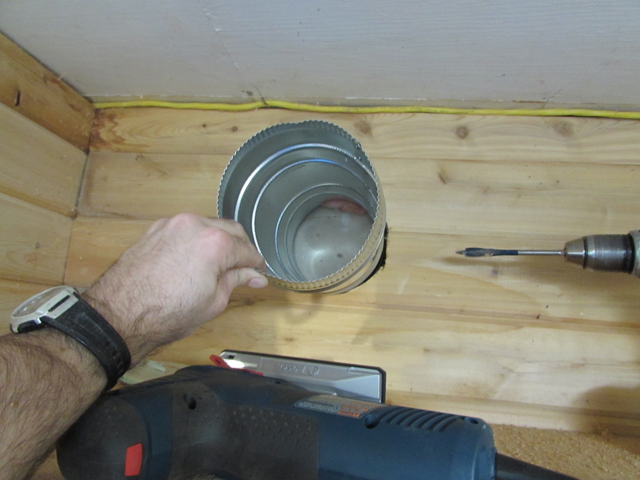 I started with the penetration from the shop to the garage. I drilled a center hole through the wall first, then cut out the shop side with a jig saw and the garage side with a drywall saw.
