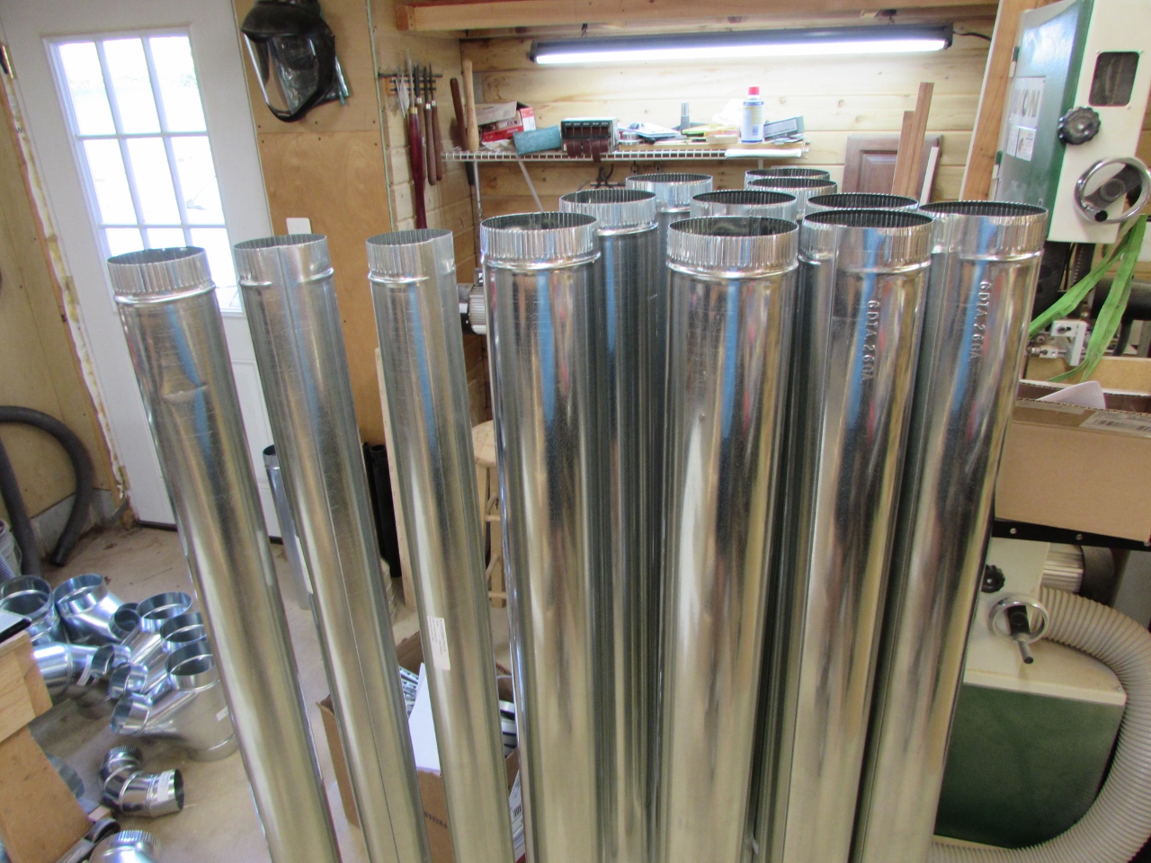 This really isn’t a woodworking project, but it should make a big difference in my shop. I recently upgraded my dust collector to a 2hp Laguna. It has enough suction to handle several tools running at the same time. Until this weekend, I have been working with three jury rigged flex hoses. None of them long enough to reach very far. the dust collector is larger and less mobile than my old one, and it is 220V limiting my ability to dust collect elsewhere in my shop. I spent some time researching dust collection systems before buying the Laguna, but didn’t give a lot of thought to ducting up the shop. There are some really nice ducting systems out there, but they can cost you thousands of dollars. I decided to try the economy ductwork offered by Penn State Industries. I started by laying out my shop Duct Layout.PDF, then I pulled together a list and placed an order.