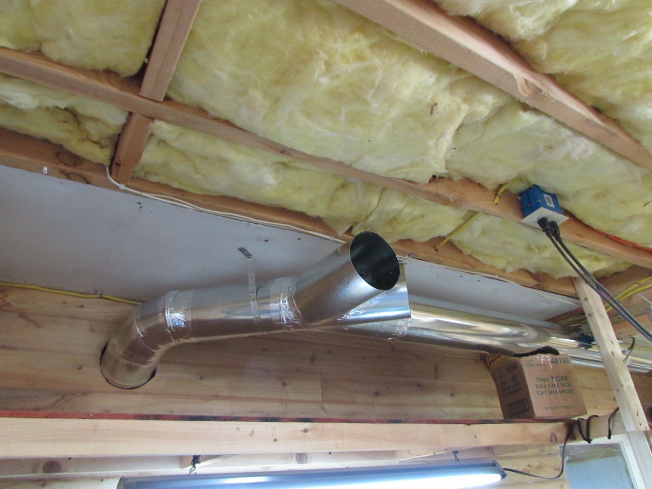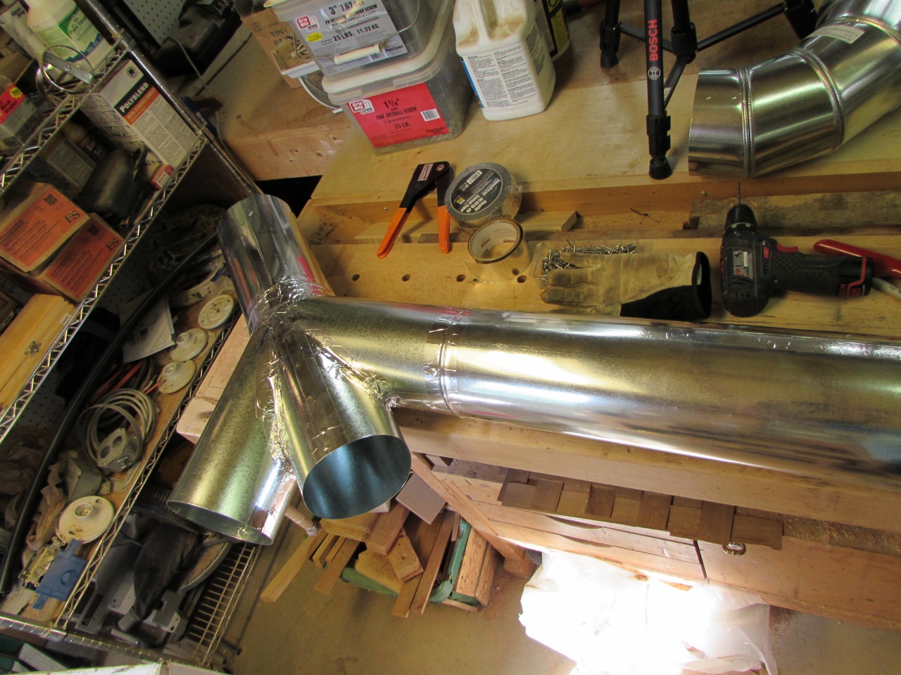 First thing I noticed, about the ductwork, was that it was almost identical to the ductwork you run in your house, but way heavier to prevent imploding under a strong vacuum. Regular ducting may have worked at half the price, but I didn’t want to go through all the effort installing it to have to tear it back out to upgrade if it didn’t. All the joints of the ducting were going to need sealing. Penn State suggests caulk or hot glue. Both of those seemed messy and unreliable to me. I opted for aluminum duct tape. It seals really well and it is strong. The elbows are adjustable and a couple of them pulled apart under the slightest stress. The tape held them firmly together. Strong enough to hang the flex ducts from anyway.