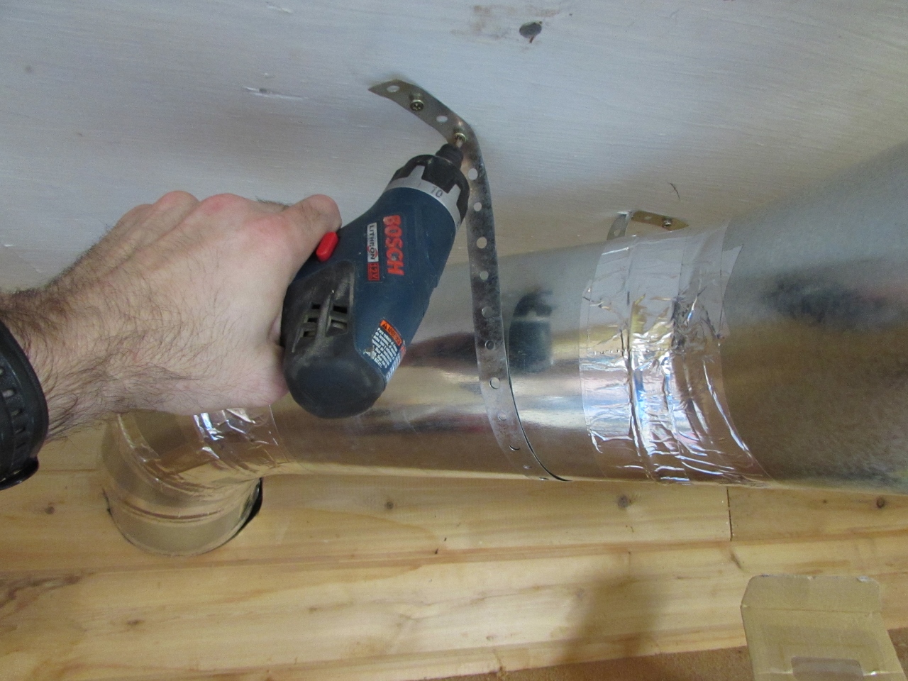 All of my joints were held together with at least three pop rivets each. Just a warning to anyone considering this option, riveting and taping triples the time it takes to install the system. It is about a third of the cost of some of the nicer ducting systems, but it makes up for it in time consumption.