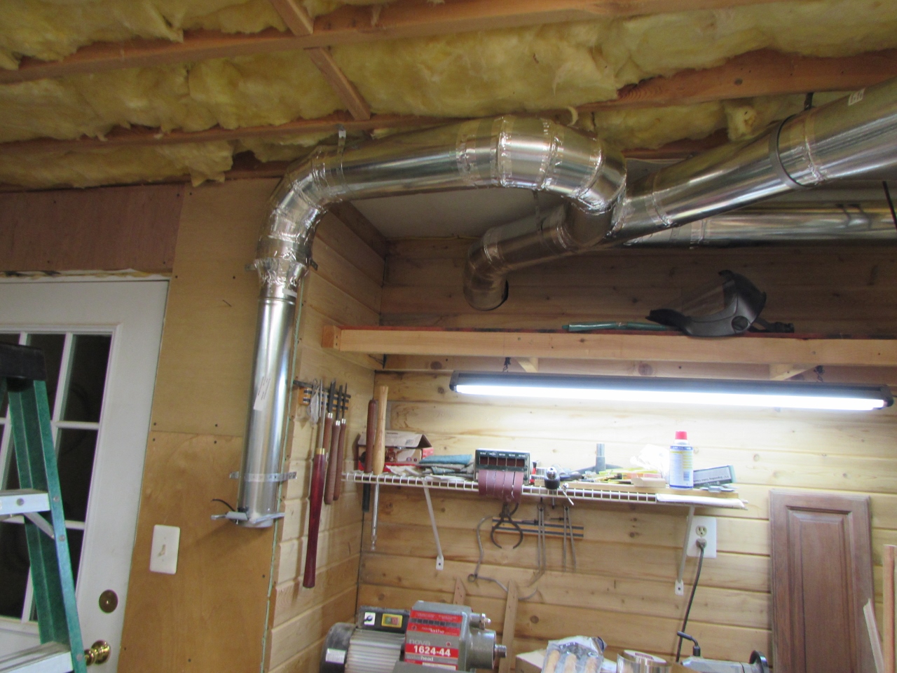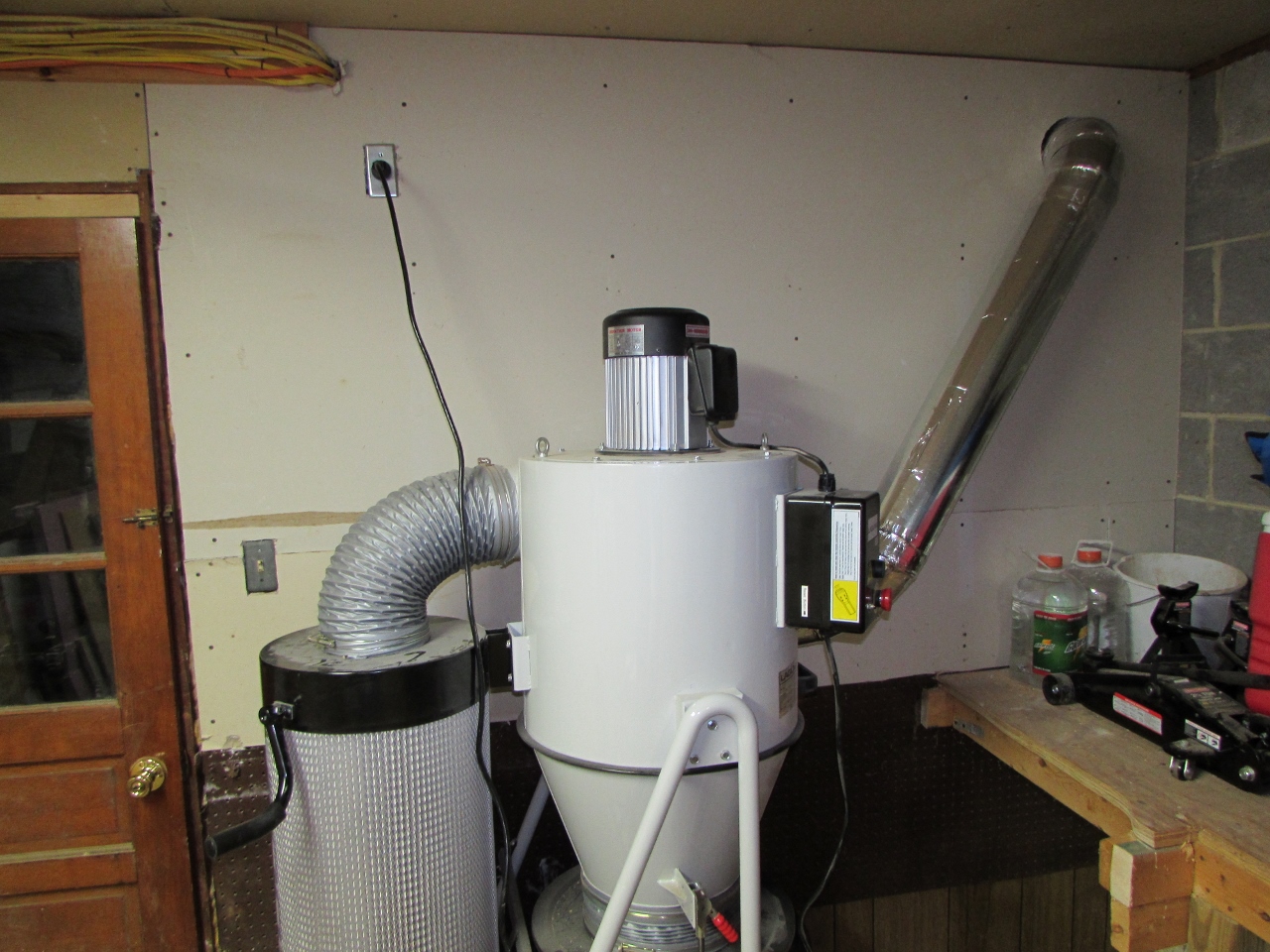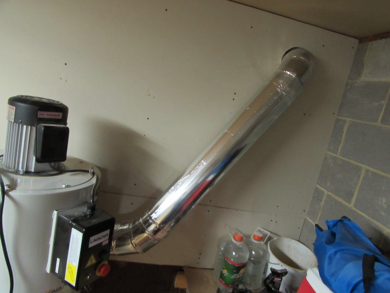 Now that the main trunk was installed, I connected the other side of the wall up to the dust collector. Later, I will come back and mount a bracket to the wall that I can strap it to, to hold the pipe the required distance from the wall. This will prevent damage to the ductwork if the collector has to be moved.