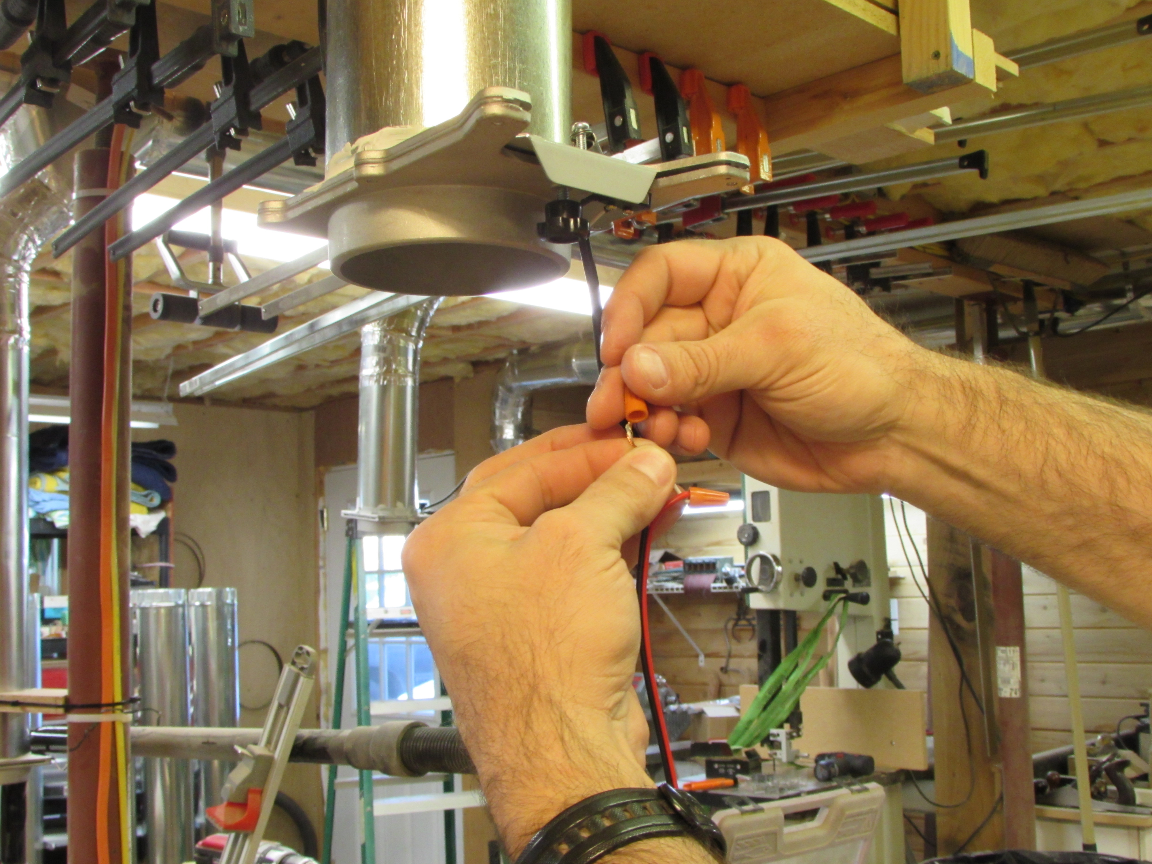I attached the wire to each switch with the included wire nuts, then ran the wire along the duct to the next drop or intersection. I held the wire in place with a bit of aluminum tape. I was going to wrap the wire around the pipe as I went, but I thought that would use up a lot of wire.