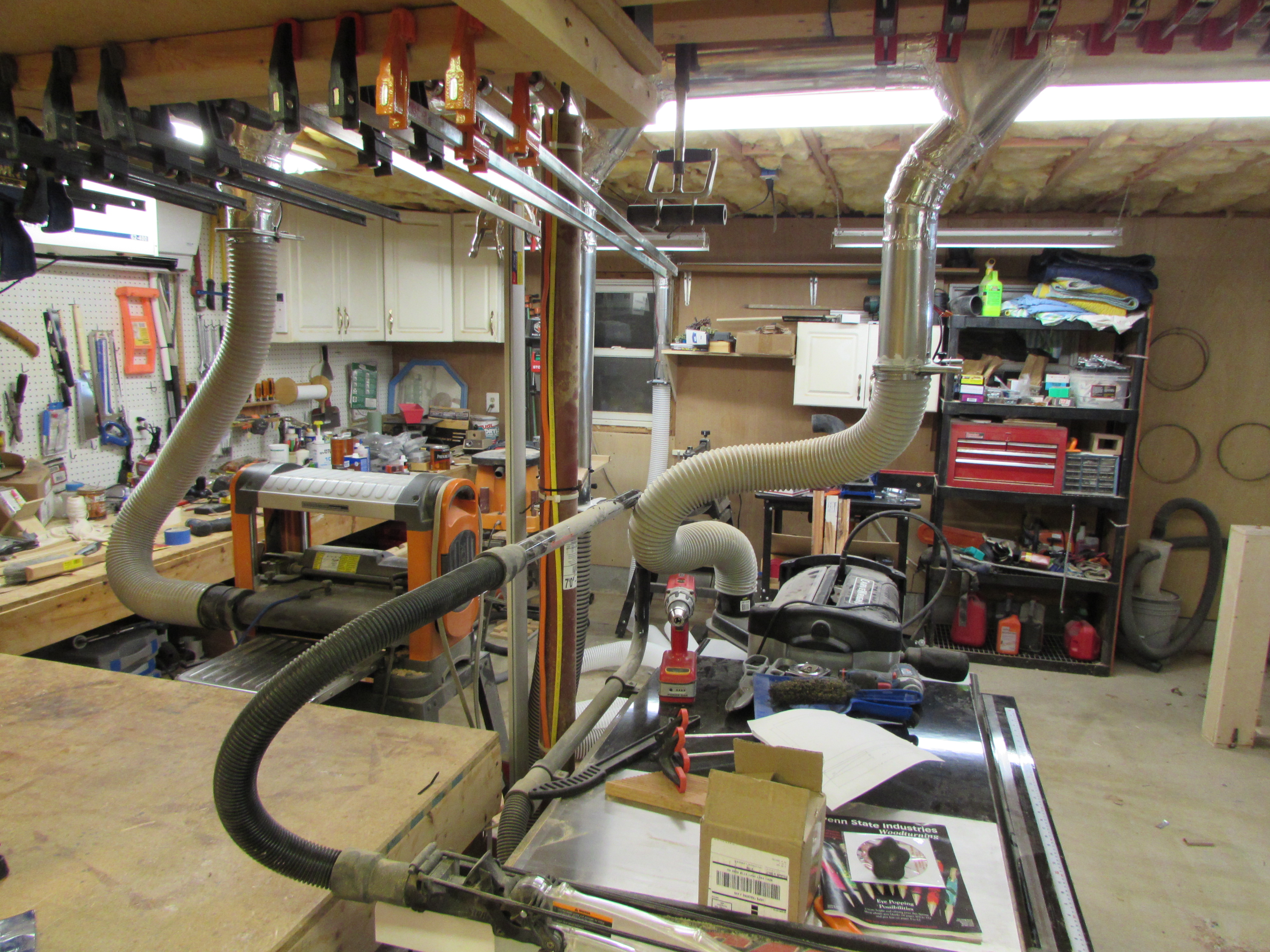 I found Penn State Industries’ flexible hoses to be far too rigid for any of my more mobile tools or for any sharp bends. I resorted to using my old flex lines that I got in a Delta kit, several years ago. Some of the drops, like the one near the lathe and the miter saw, are just hanging for easy clean-up. When I come up with a better way to collect around those devices, I will attach them. Now, I just have to clean up the huge mess that I created when installing everything. I can barely walk through the garage anymore. Might be time for a dump run…