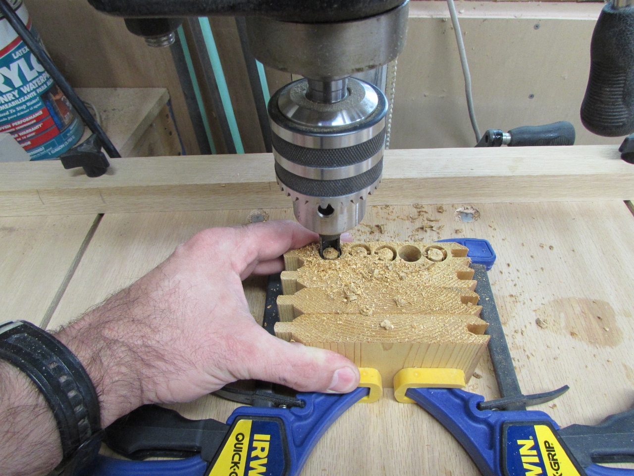 The next step was to mark the depth of the dowel, on my drill bit, then start drilling holes.