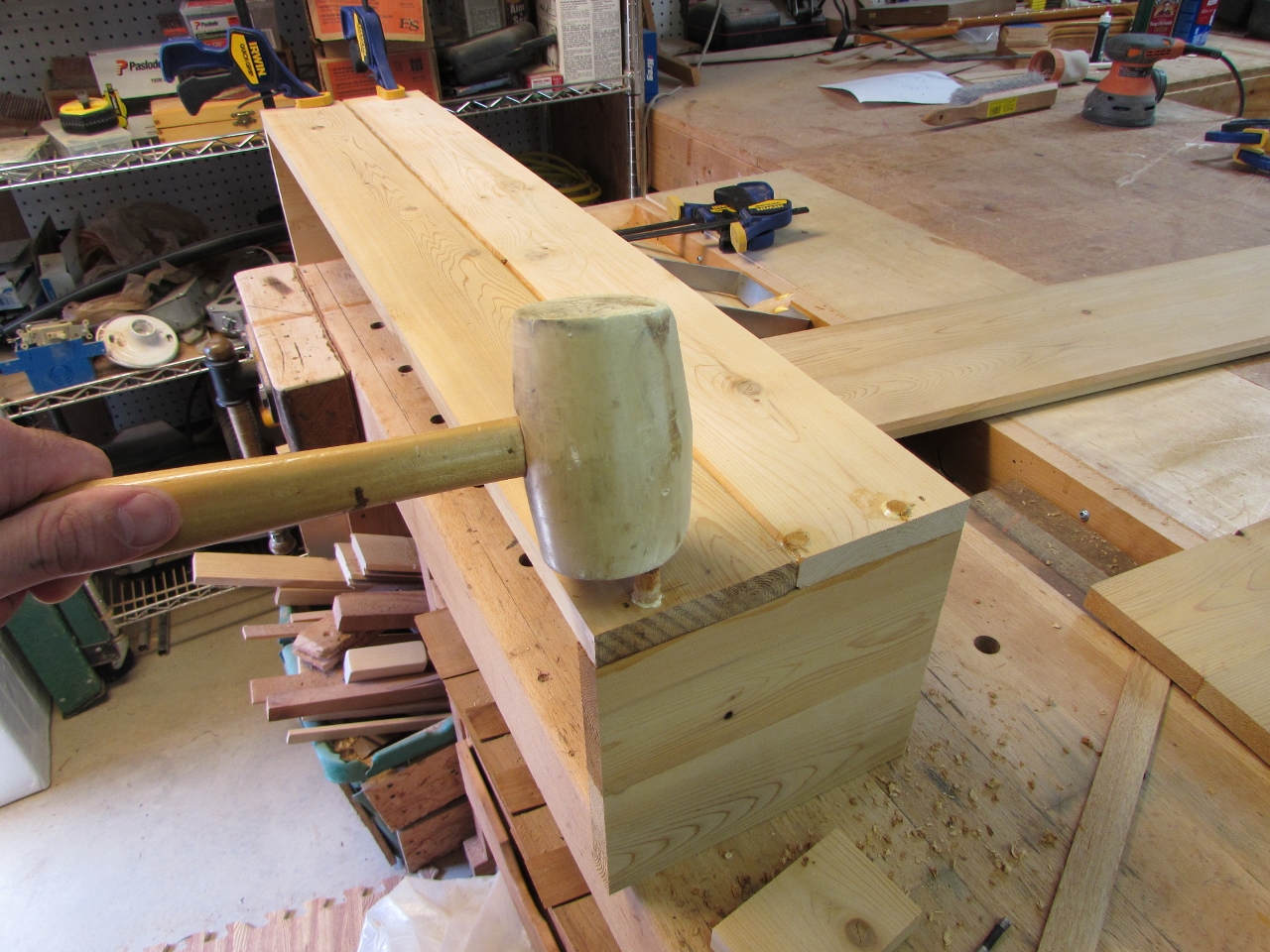 Since there will be a large amount of wet dirt in the box, it will probably be fairly heavy. To add a bit more support, I want to pin all the joints together with dowels. since I don’t have any cedar dowels, I decided to make some. I cut and clamped up a bunch of scrap pieces of cedar, with the end grain pointing up and down. Next, I used my plug cutters to create 1″ long plugs at 3/8″ and 1/4″ in diameter.