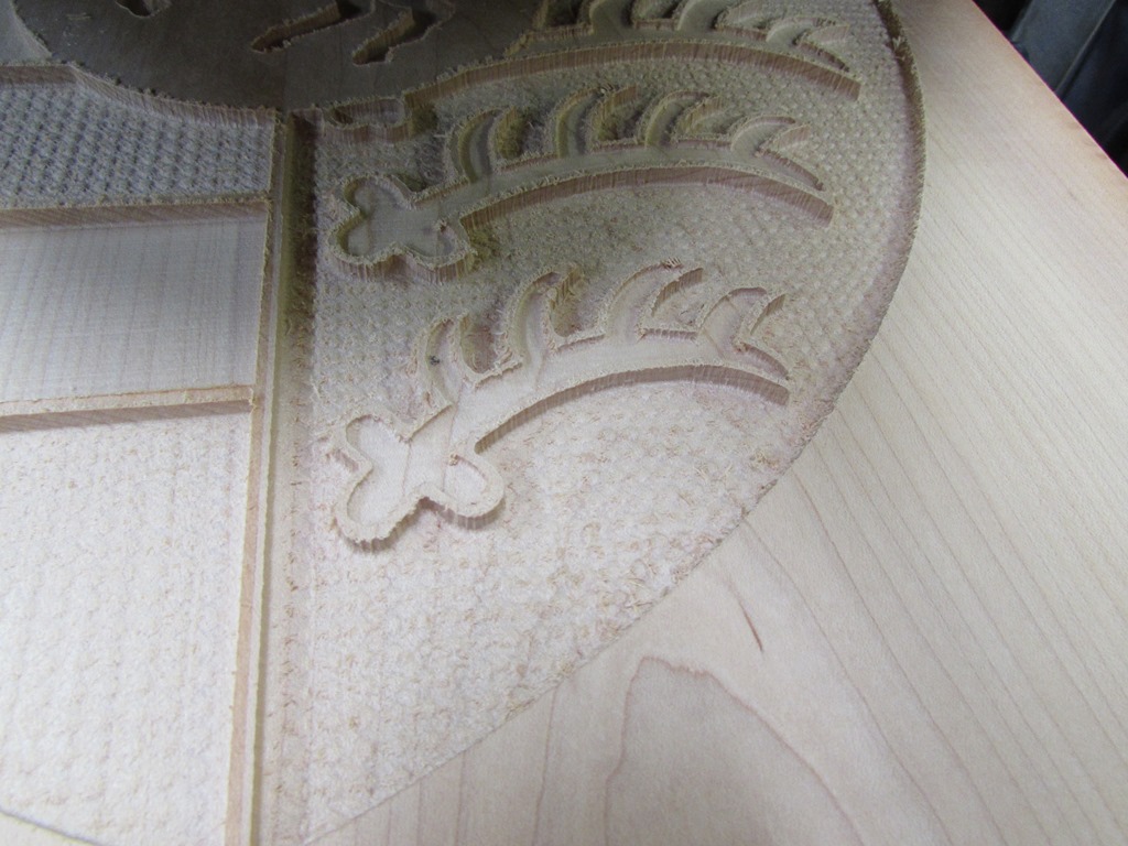 It took 4-1/2 hours to complete the carve. The best quality would have taken close to 9 hours. I used maple because it has a hard, close tight grain. I still had a bit of tear out on the antler-looking things in the picture below. This is mainly a test carve to check out my program. I will fix any problems with the program, after this one is run, then run a new board at optimum quality. That will slow the cutter down and hopefully remove the tear-out problem.