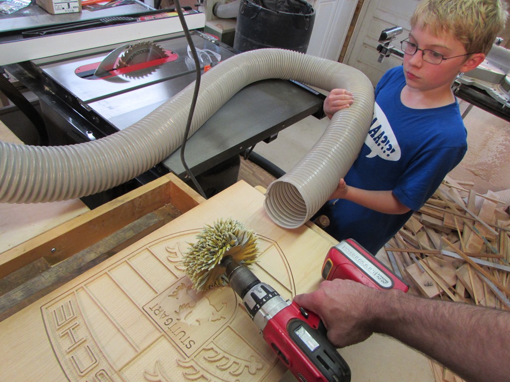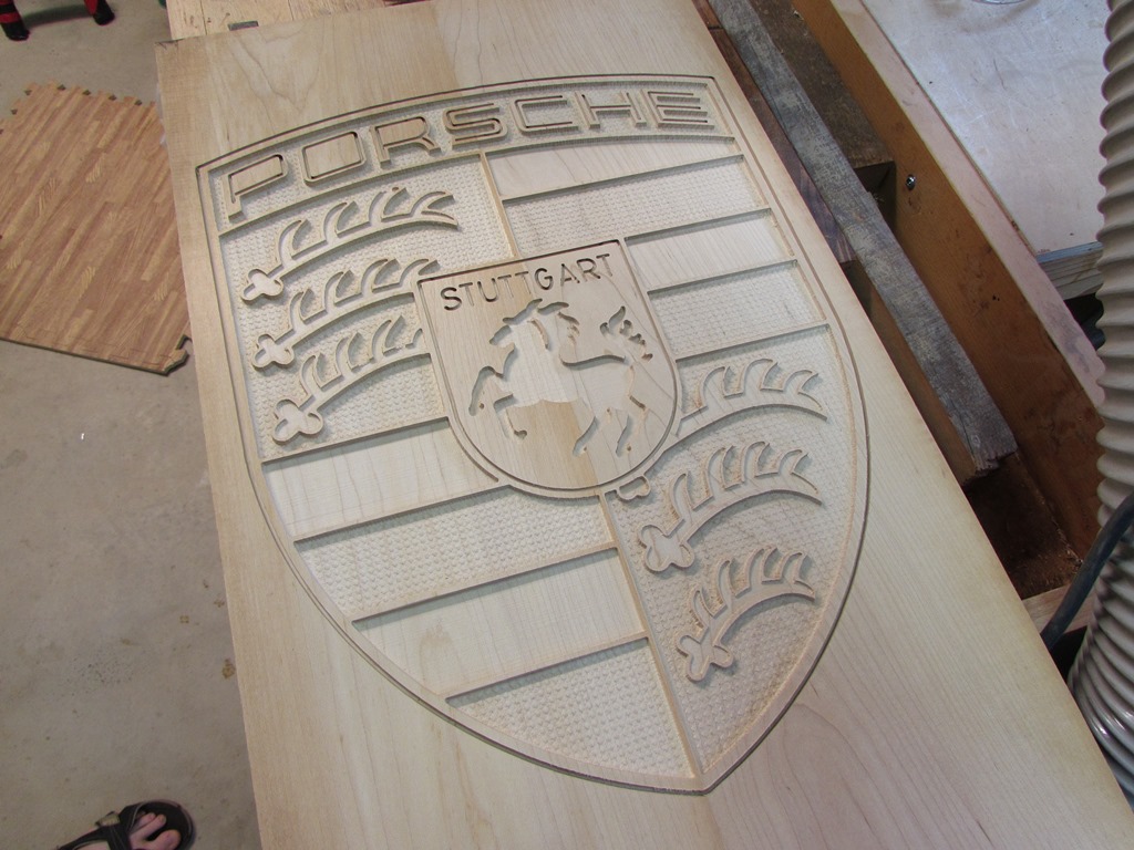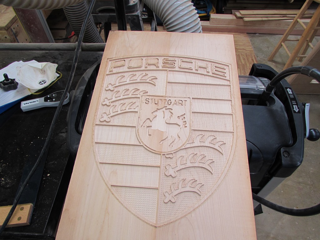 Not a bad first run. I forgot to recess the blank sections in the first three letters of “PORSCHE” and I had some small tear-out problems, but all-in-all a pretty good success.