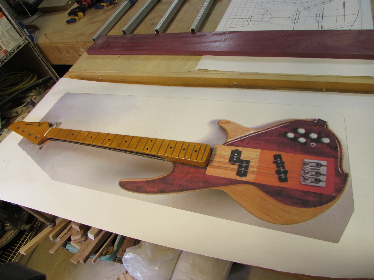 My friend Rick gave me a bass guitar neck. Now that I have the neck, I have to build a body to go with it… I did some searching on the web until I found a design that I thought looked like a challenge. I found one, that I liked, at Conklin Guitars. I cut and pasted in the pickups and tail piece that I wanted, then I referenced the image into my Cad software. This enabled me to create a full size image that I could print out full-scale. I decided not to use the CNC on this guitar because I wanted the challenge of shaping it by hand.