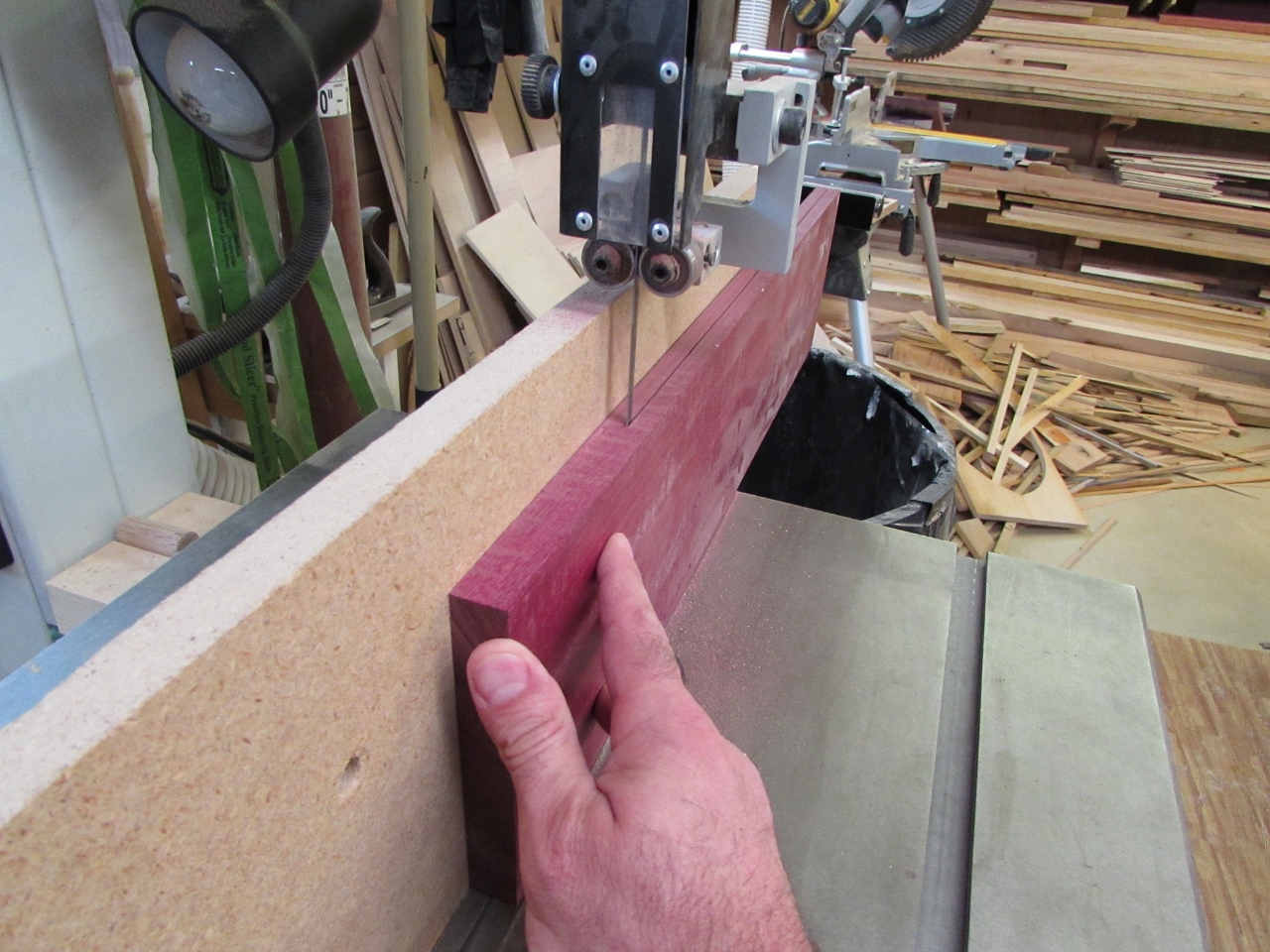 I started with a 48″ long, 6″ wide piece of curly purpleheart. This should be just enough to cover the front and rear of the guitar. I cut the board in half on the miter saw, then re-sawed it on the band saw to create four pieces, roughly 3/8″ thick.