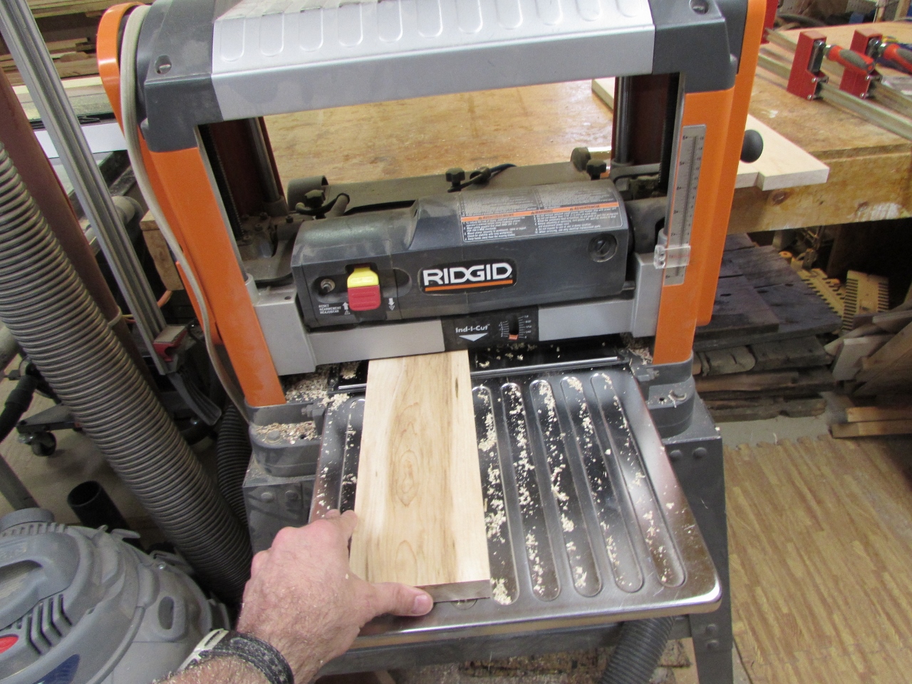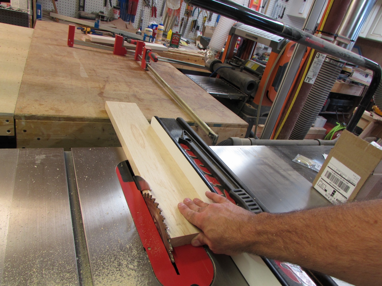 The core of the guitar will be maple, to match the neck. It is not as dense as the purpleheart, but it offers a nice visual contrast. I cut and ripped a piece of maple, from my stock pile, down to 24″ lengths.