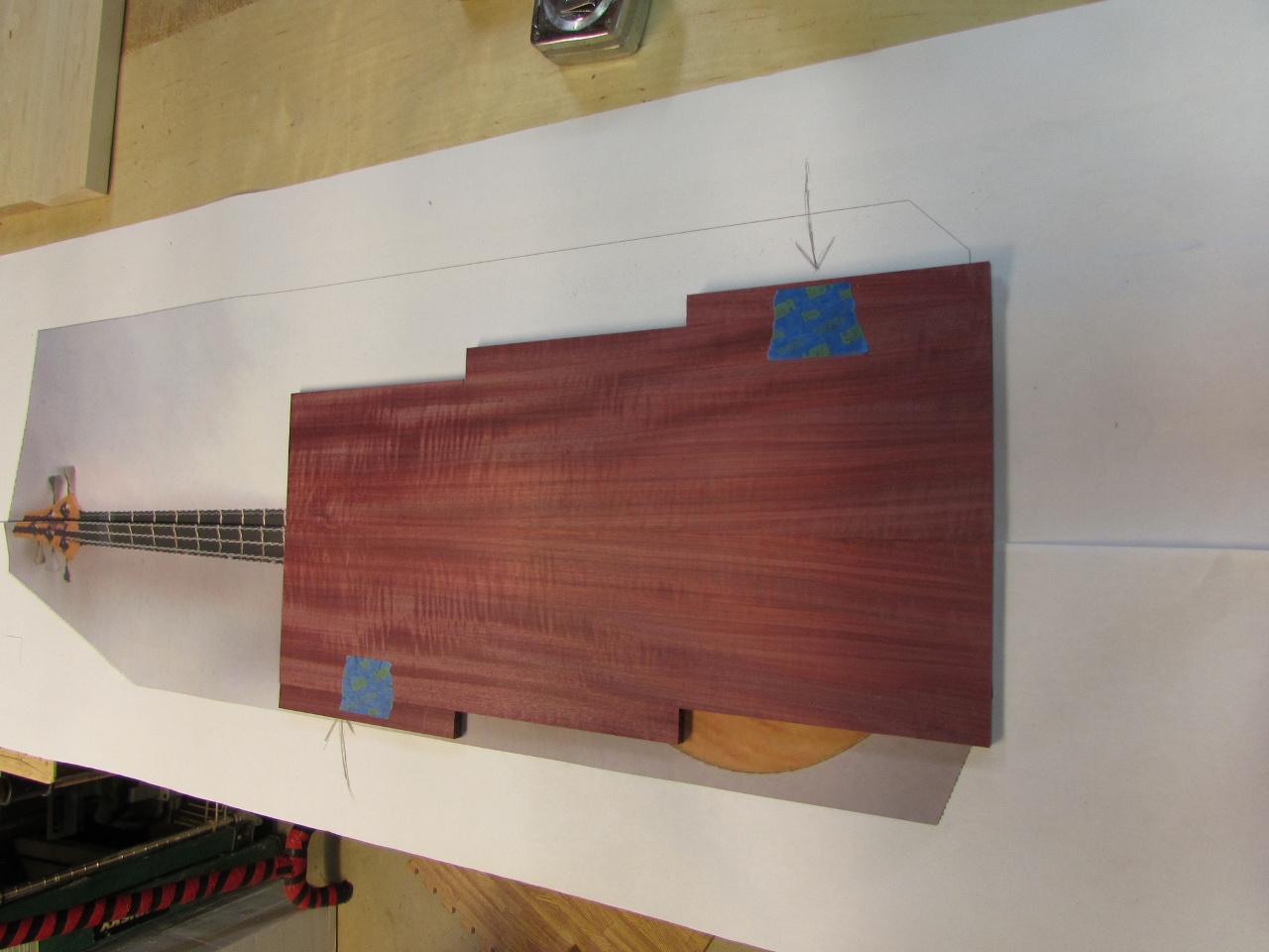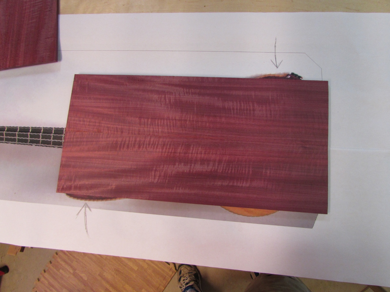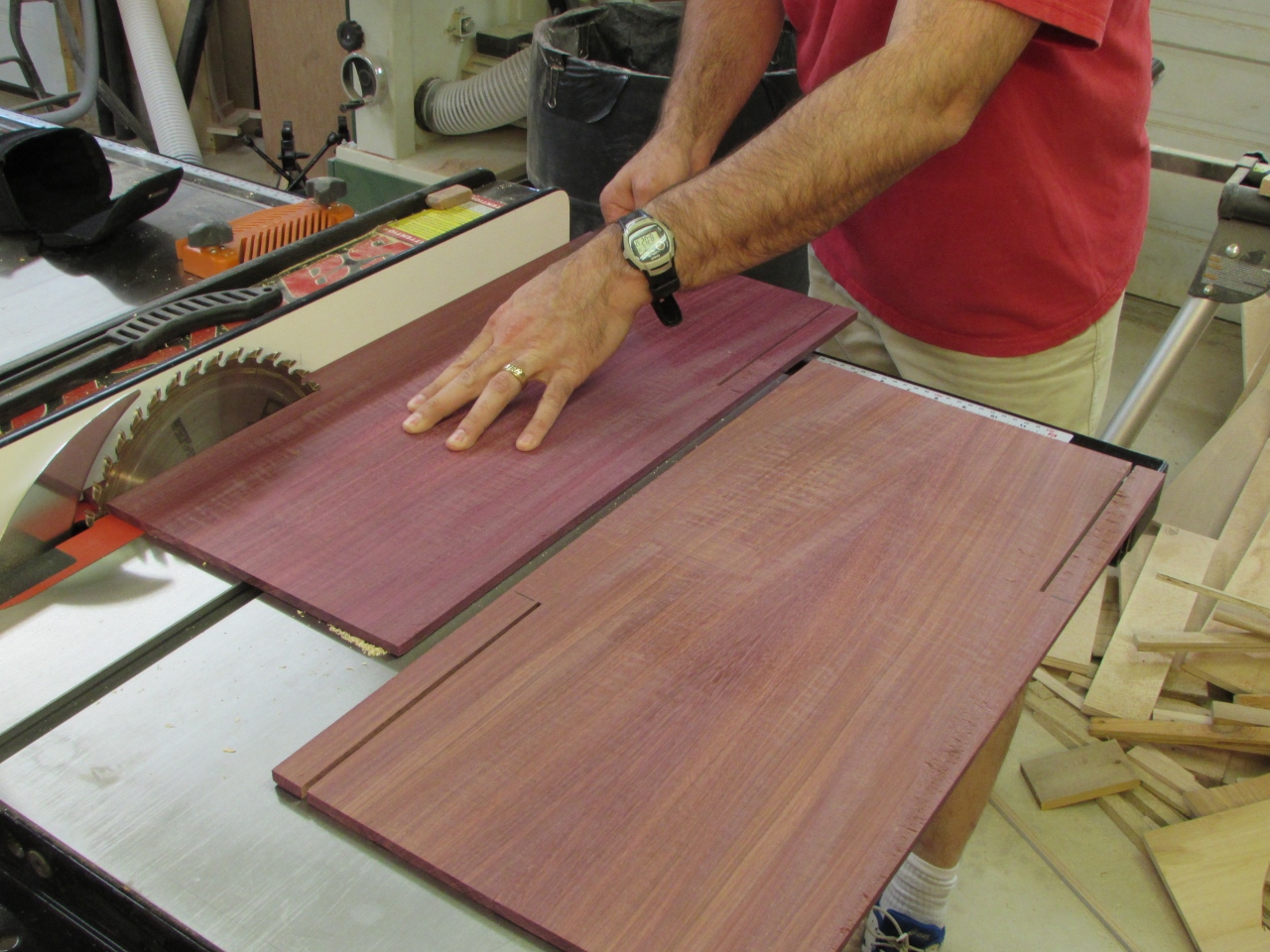 Checking the purpleheart against the plan image, I noticed that it was a bit too narrow. Since these were book matched boards, I reasoned that I could cut pieces from the unused corners and attach them to the opposite sides, and it will still be book matched.