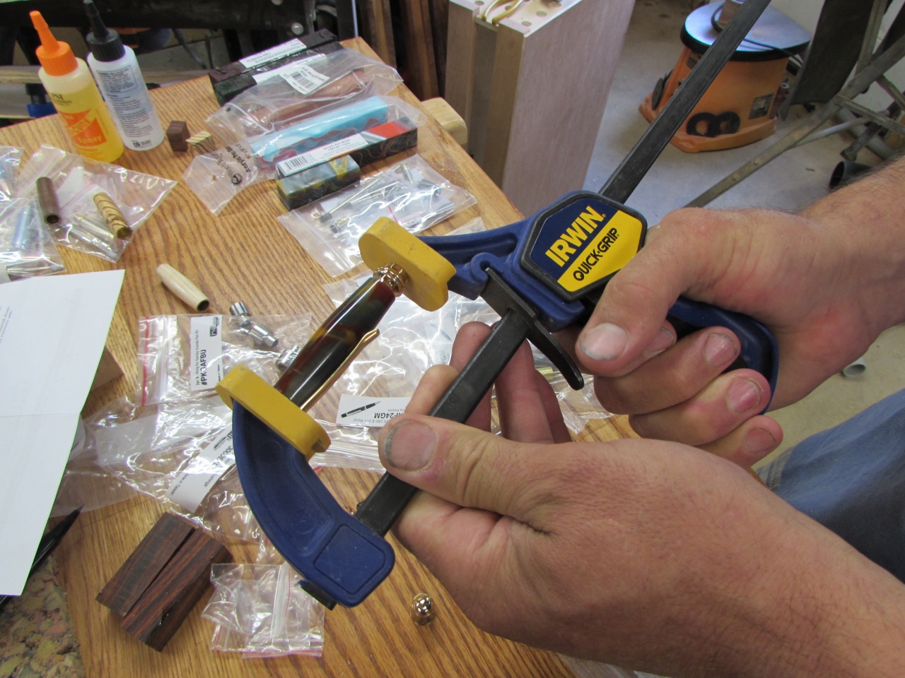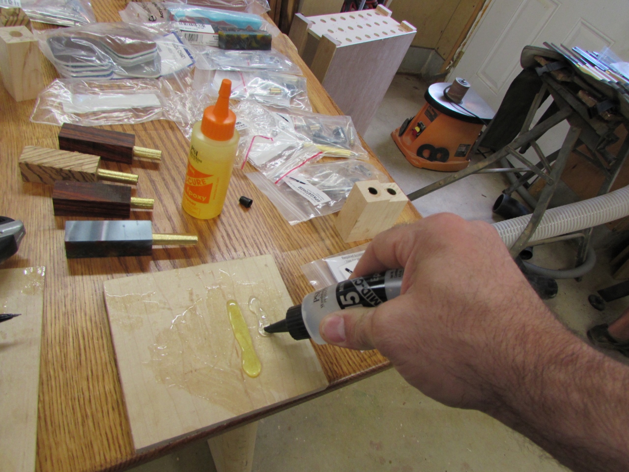 Since the main body of the pen requires a tube to be epoxied into it, I prepared a few ahead of time. When Ed arrived, We cut and drilled some of his blanks, then mixed up epoxy to glue the tubes in.