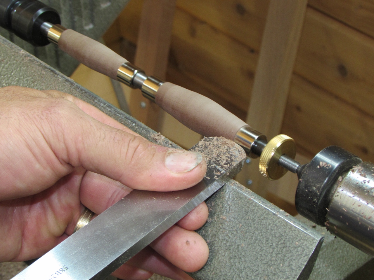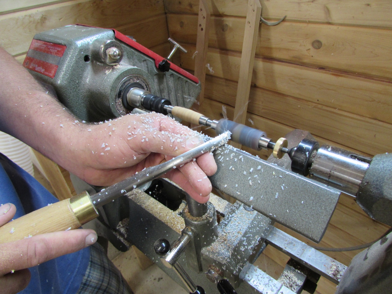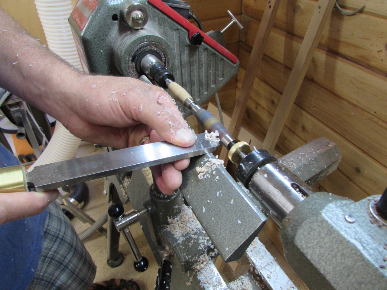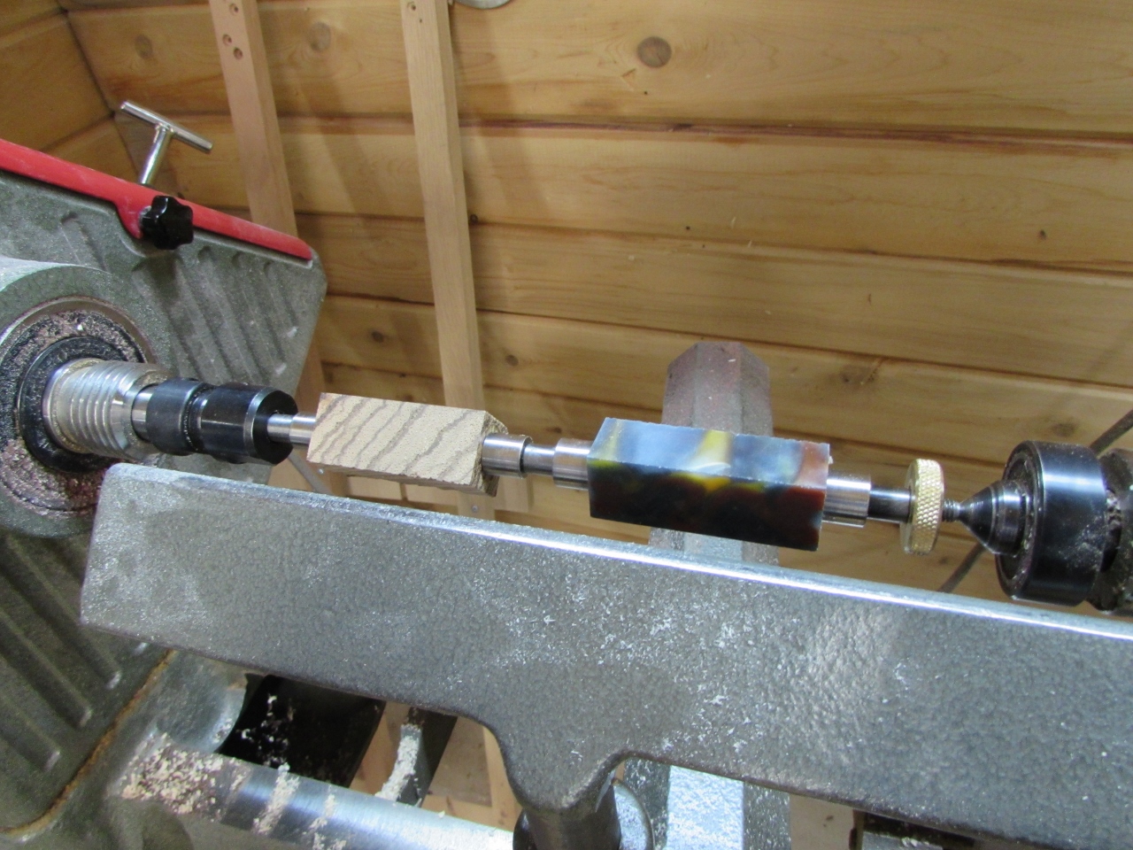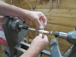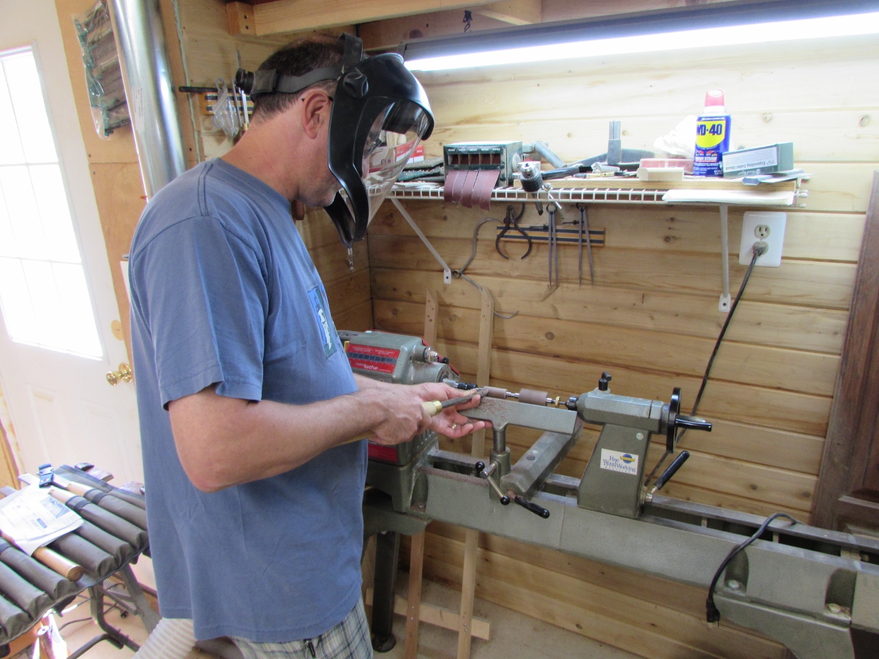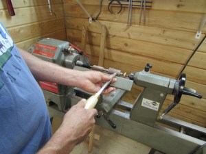 While the new ones were drying, I set some of the dry ones up on the lathe for Ed to start cutting.