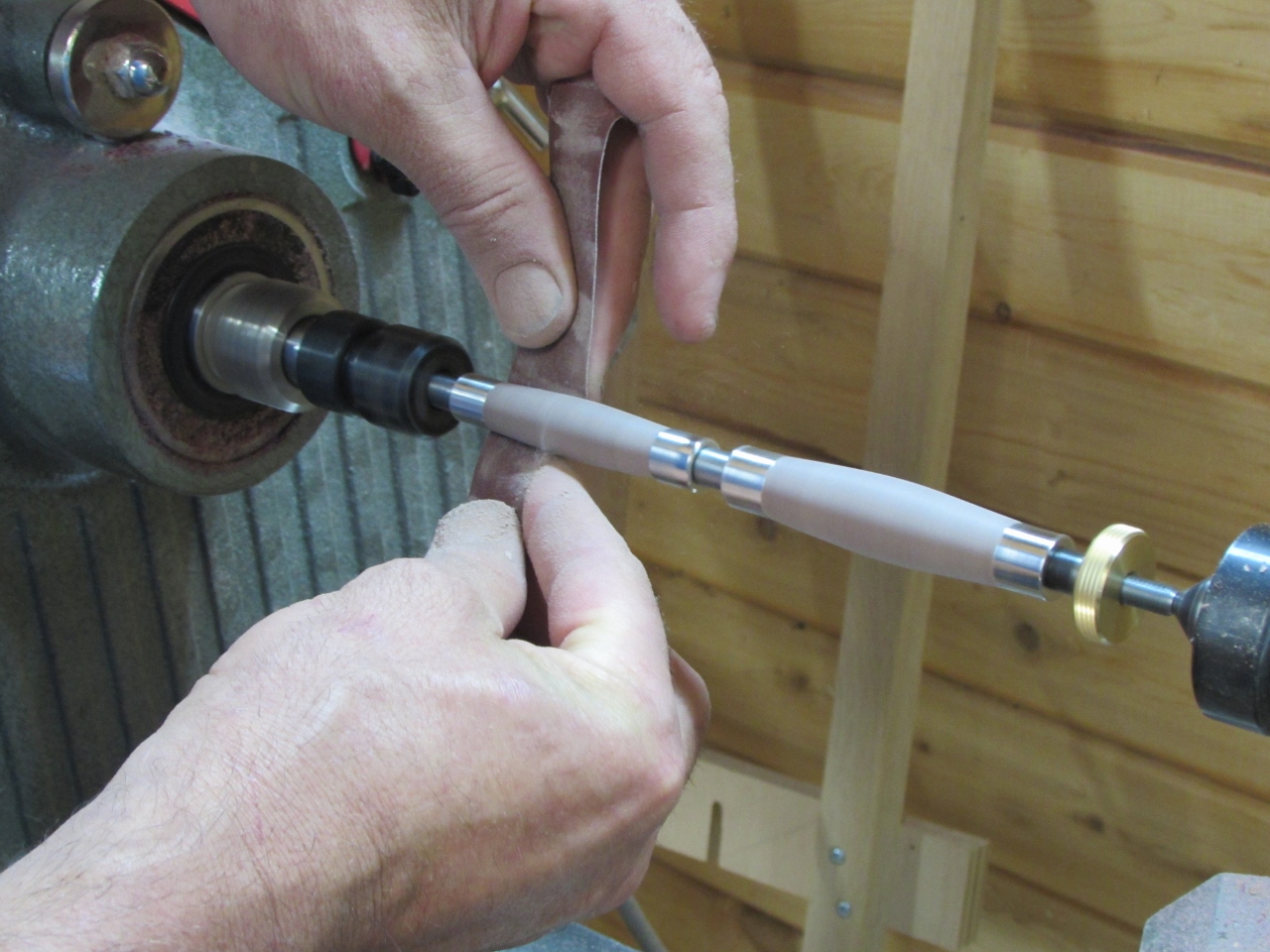 The wood blanks get sanded down to 600 grit, then friction polished with the shellawax, but the acrylic gets sanded down to 12,000 grit. We had to get a special set of micro mesh sanding pads just for acrylic. It polished up nicely though with no additional finish required.