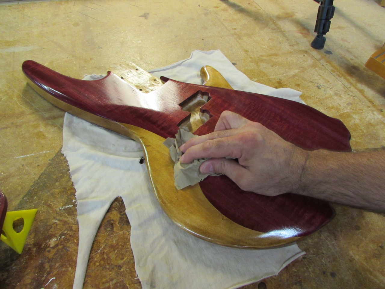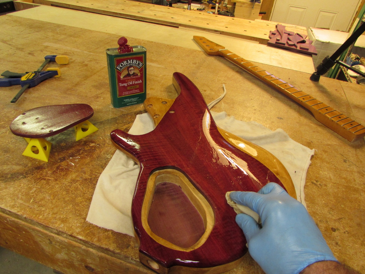 I got up bright and early yesterday to put the sixth and final coat of Tung oil onto the guitar body, before I went to work.