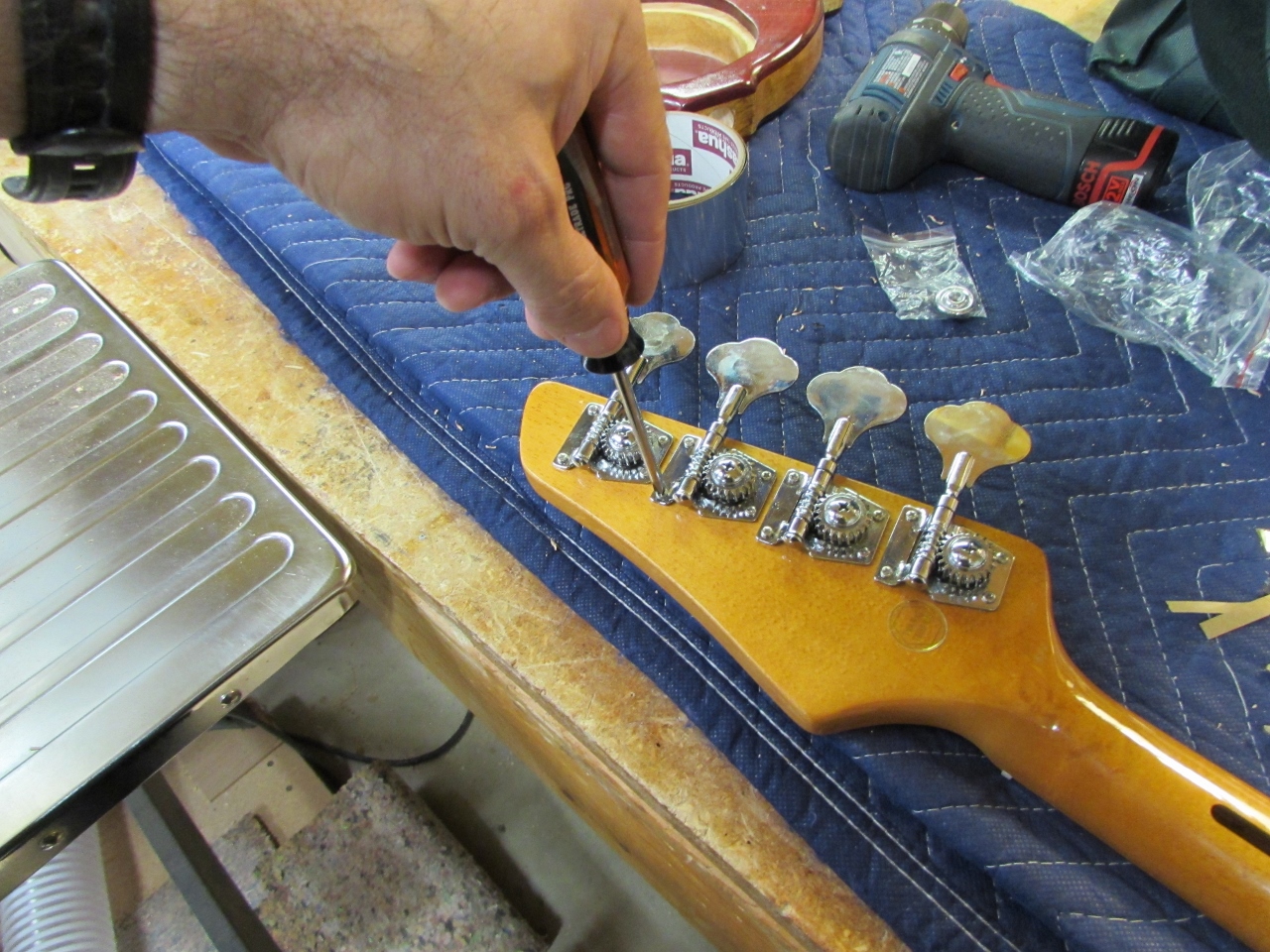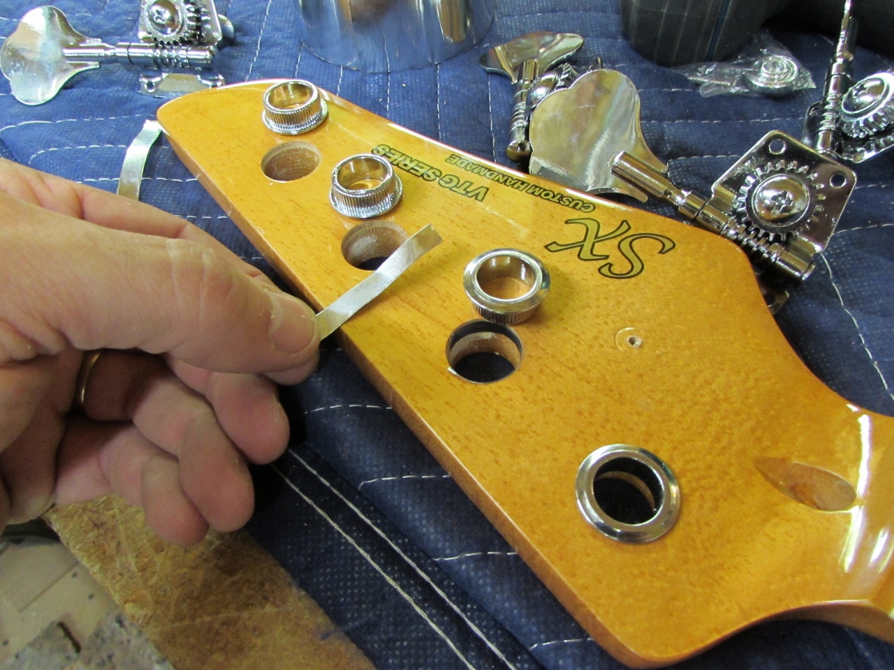 The bushings, for the tuning heads, are supposed to press in tightly, but mine were loose. To correct this problem, I cut a sliver of aluminum tape, and wrapped it around the rim of the hole. Now the bushings press in very snugly. I installed the four screws, each, into the back of the tuners to hold them in place. And, yes, I managed not to break or strip any of them…