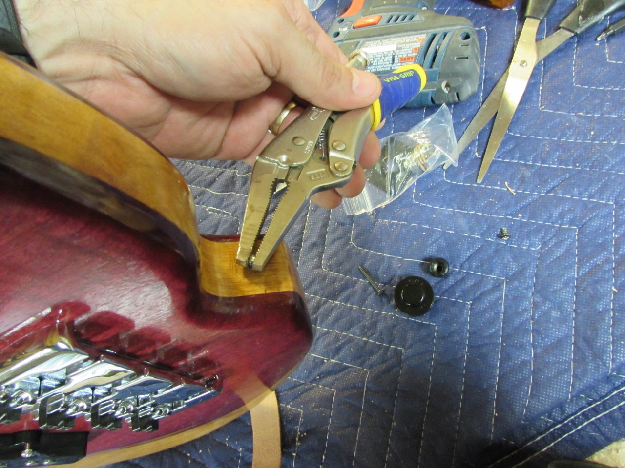 Of course, when I started installing the strap buttons, I promptly broke another screw. Honestly, I am taking my time and installing them by hand, they just give me really cheap screws! Luckily, enough of the screw was sticking out, that I could get my vice grip pliers to lock on to the stub. I was able to carefully remove the broken bit without damaging the finish too much. Man, I am running out of extra screws…