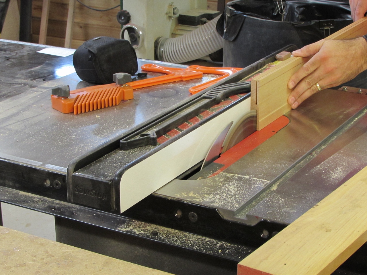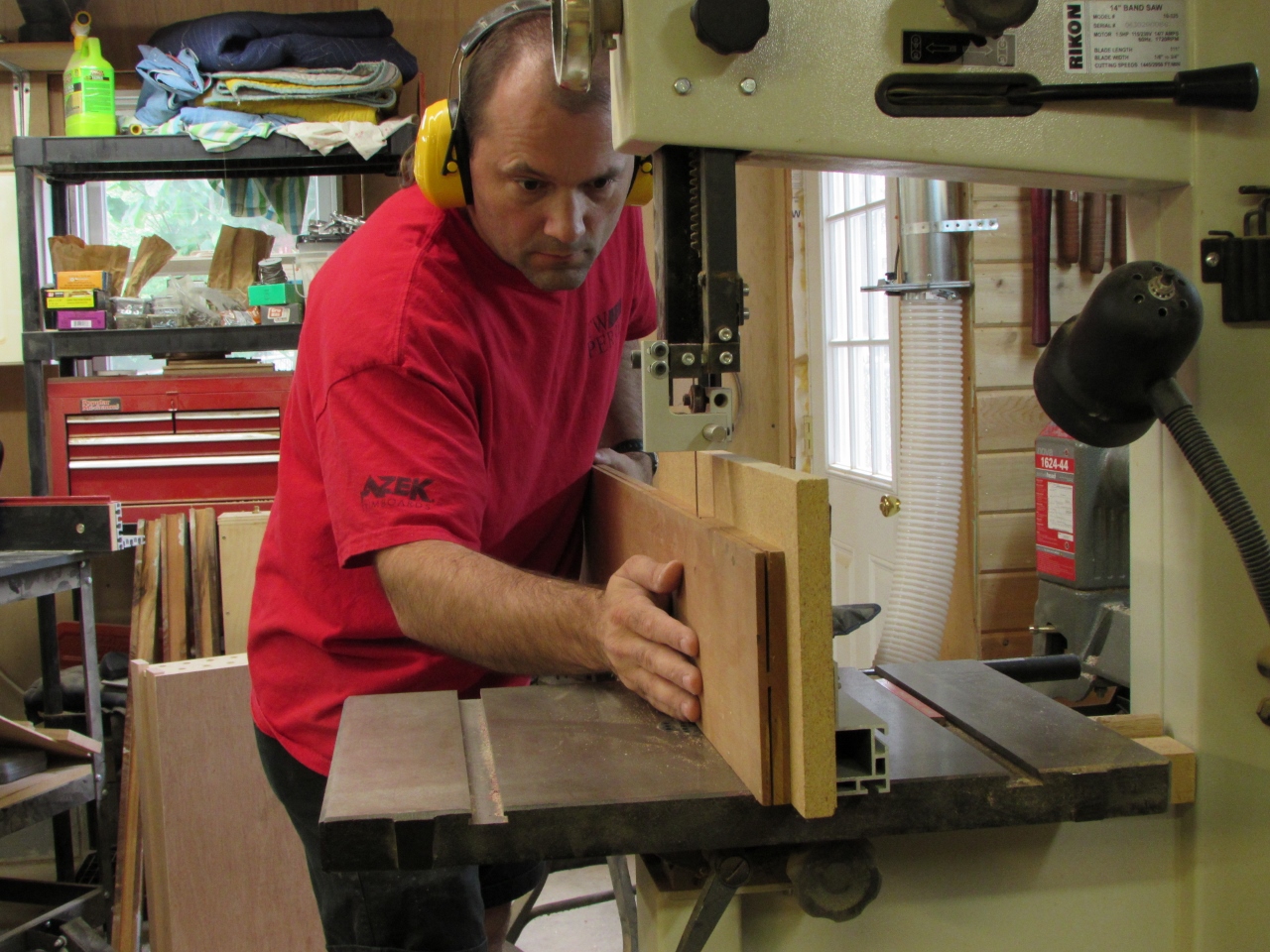 Step one is to resaw a few pieces of scrap down to about 3/8″ thick. I start with the table saw, then move to the band saw to finish the cut.
