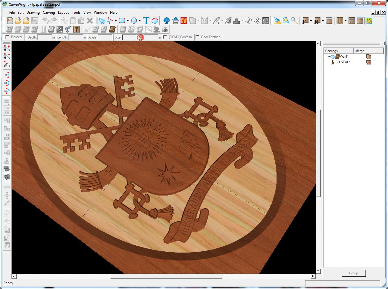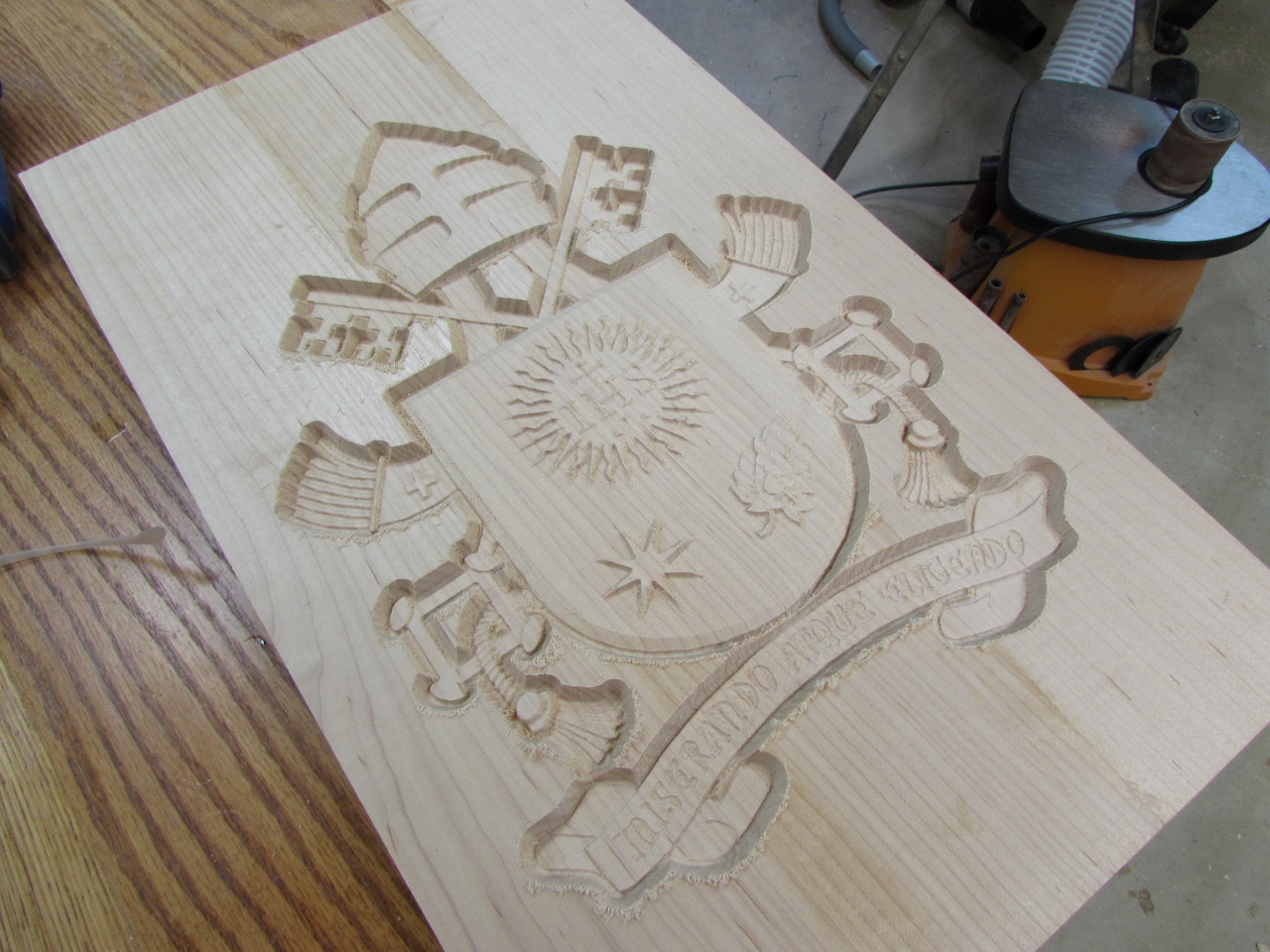 I am helping out a friend with an upcoming project. I need a couple of carved versions of the Pope Francis’ Papal seal. I spent several long hours creating a 3D model, in AutoCAD. I am trying to create the effect of a relief carving, while keeping the relief as shallow as possible. I drew each component individually, then thickened them to different elevations, raising each item 1/32″ at a time until I managed to get everything within a 5/16″ depth.