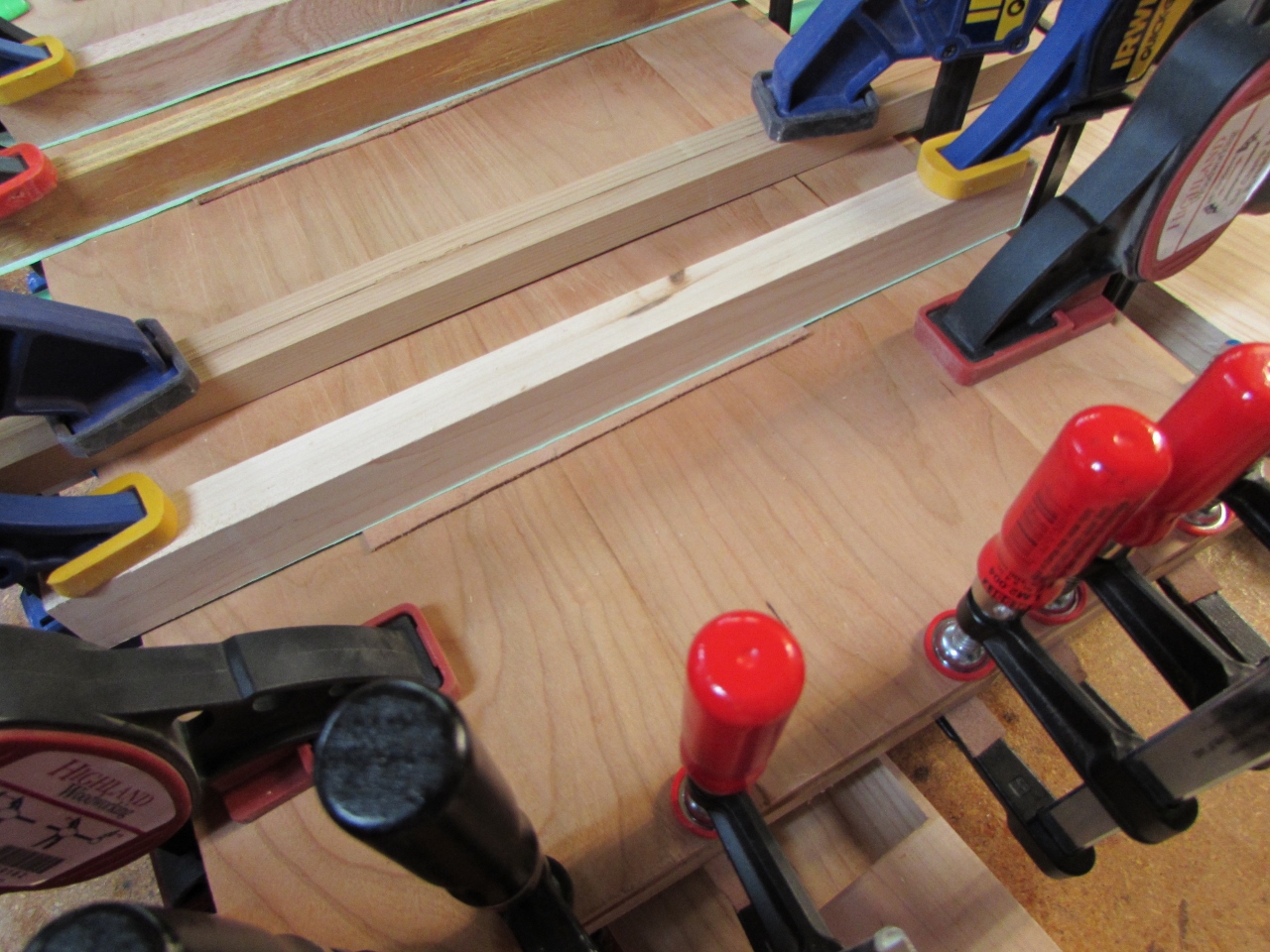 I held the cherry tight to the front edge, then clamped it down with as many clamps as I could. I also added three sets of cauls. I slipped a strip of leather under the center of each caul in an effort to press the center down as well.