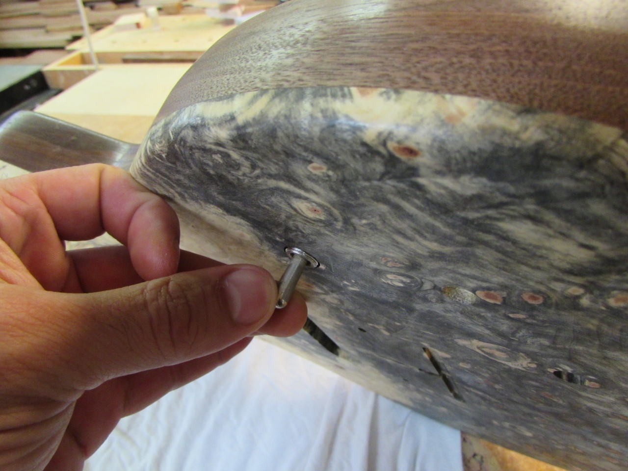 The old guitar body had a 1/8″ thick top, the new one is 3/8″ thick. Since the burl top is rather soft, I want to remove as little of it as possible. I set the switch in place and traced a line around it.