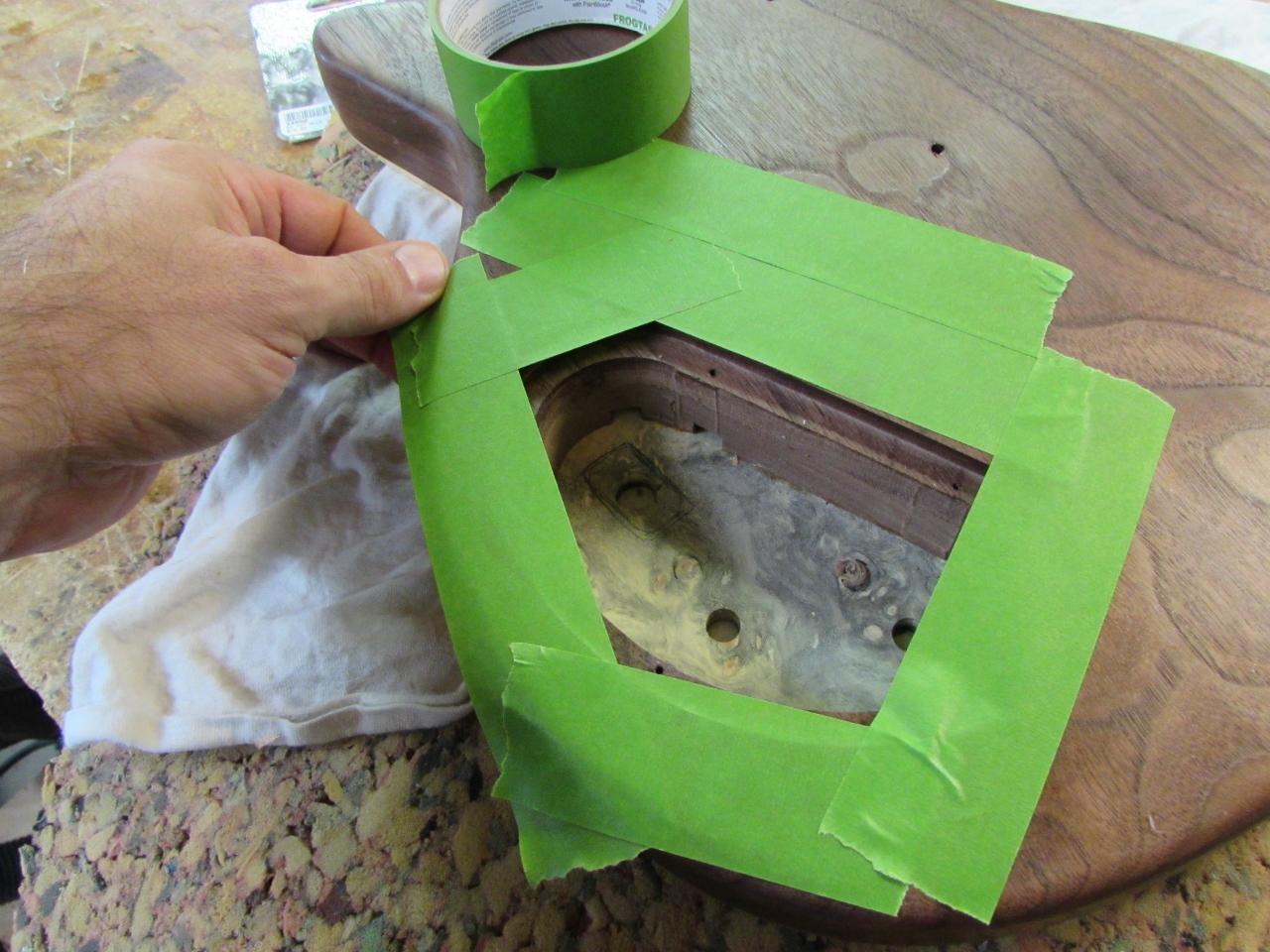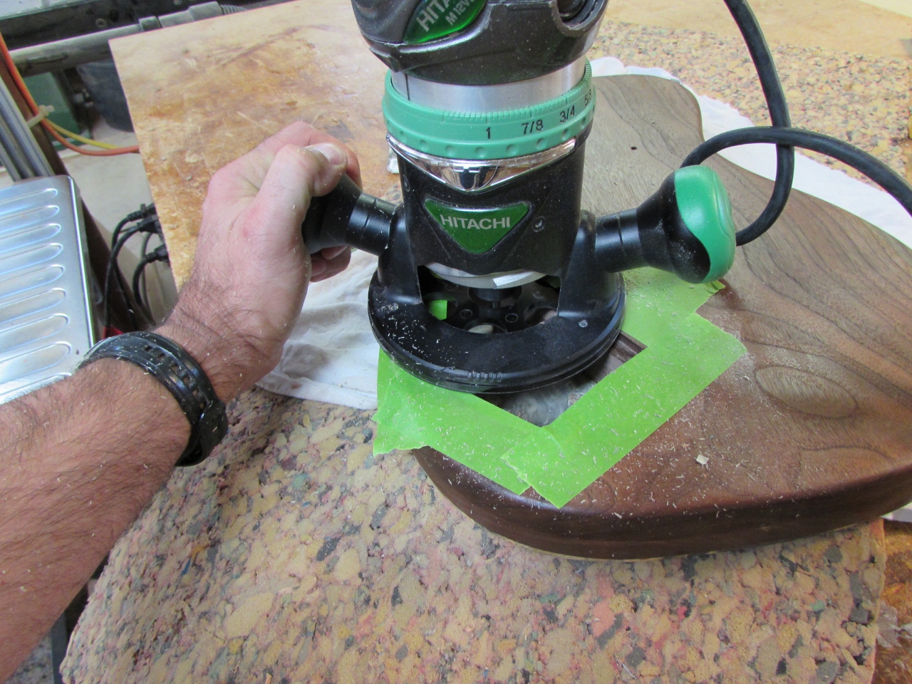 The best way to easily remove the excess wood, that I can think of, is to use my router, with a spiral up-cut bit. I taped off the area, to prevent the router base from scratching the walnut, and set my bit to cut about 3/16″ into the burl.