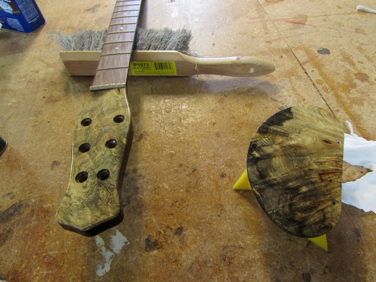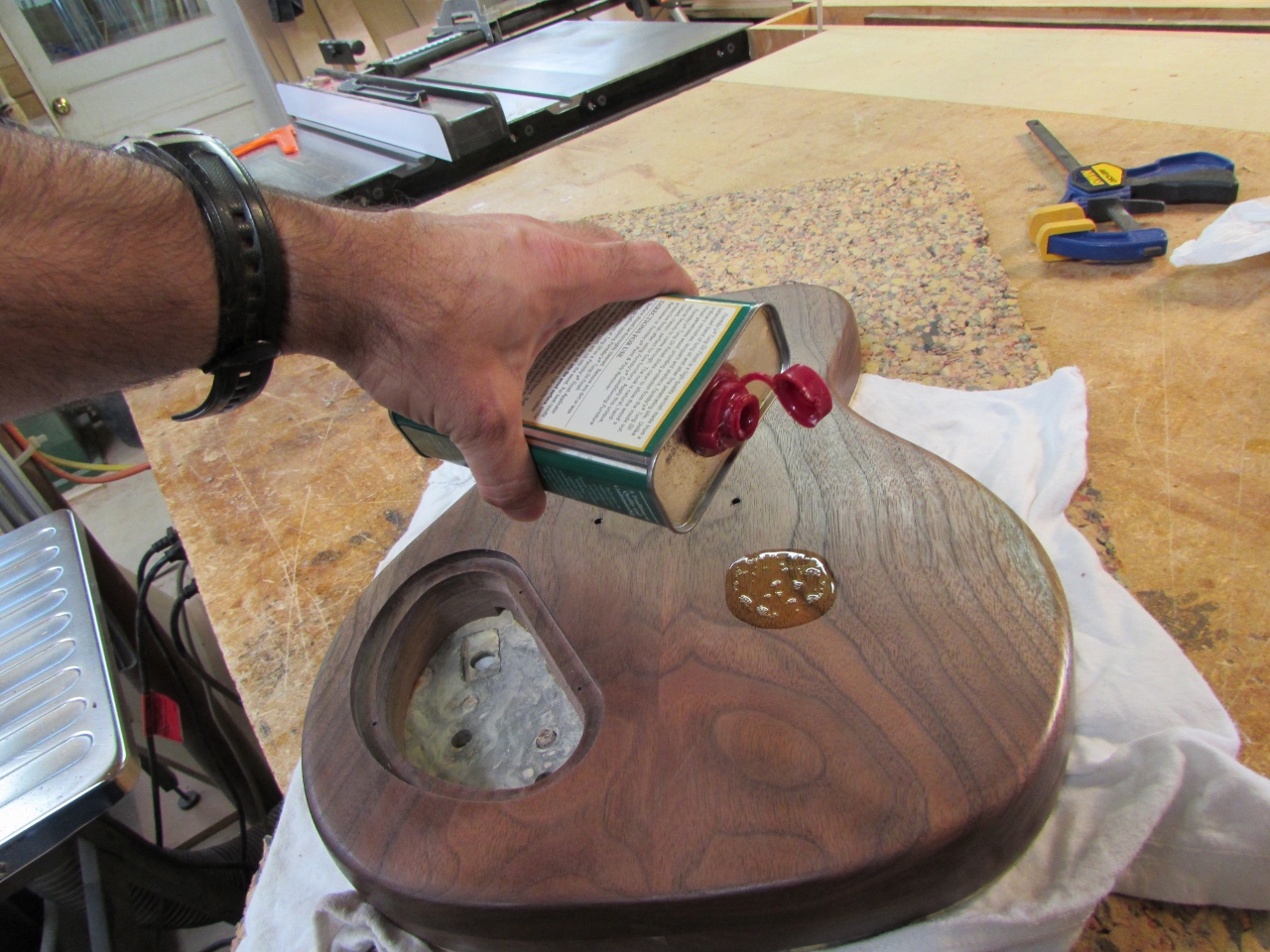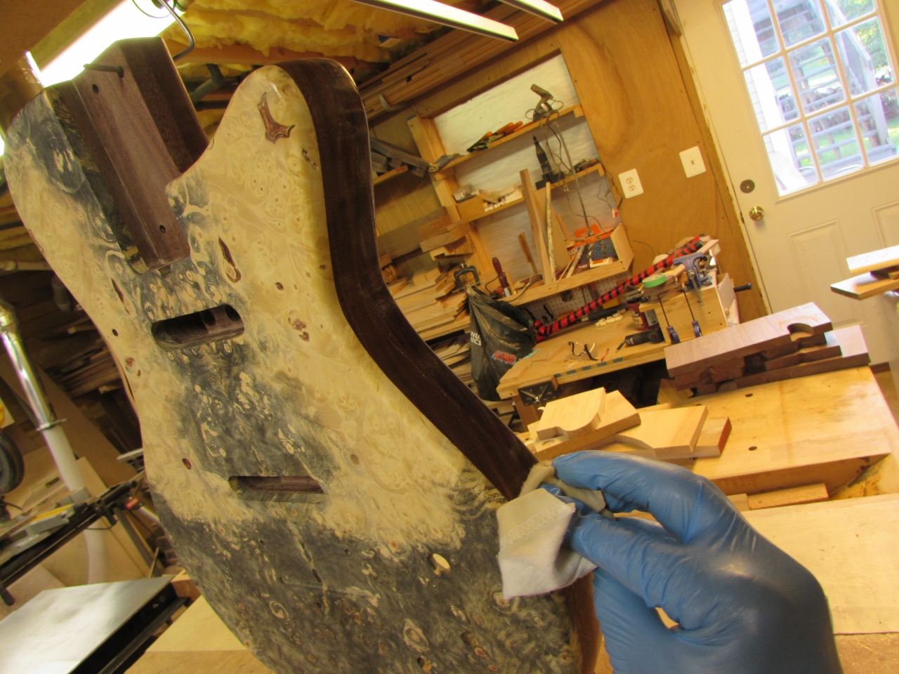 I sanded the body down with 400 grit paper to smooth things out, and started the third coat of Tung oil.