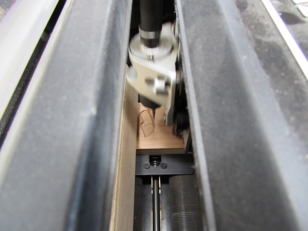 I created another program with several pieces at varying depths and rotations. My goal was to make one that matched as close as possible. The final carved piece would be about 3/32″ thick, with the thinnest part only 1/32″ thick. I reused a piece of veneer, from my attempt to re-saw the excess material from the panel, to create a 1/8″ thick strip. The double-sided carpet tape I use is way to strong for thin material, so I put painter’s tape on the back of the veneer and attached the carpet tape to that. Next, I attached the veneer to a piece of 3/4″ plywood and set up the carver.