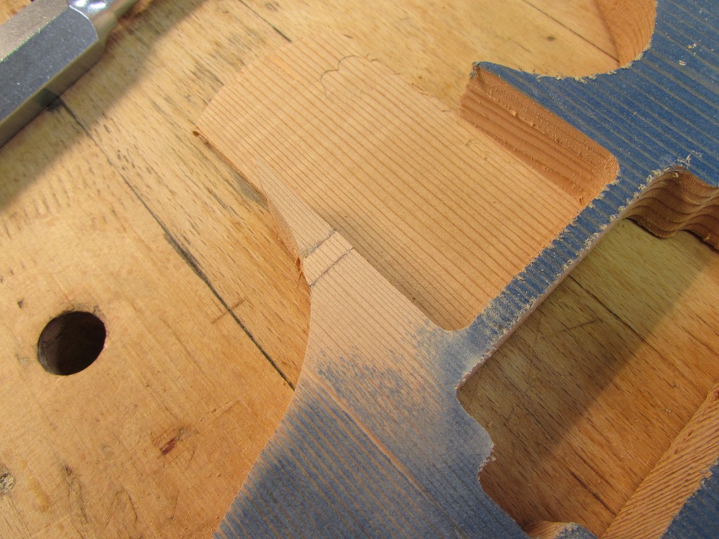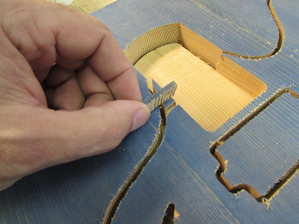 I started by cutting a plug from a scrap with a similar grain pattern, then opening up the slightly curved channel to match the width of the plug.