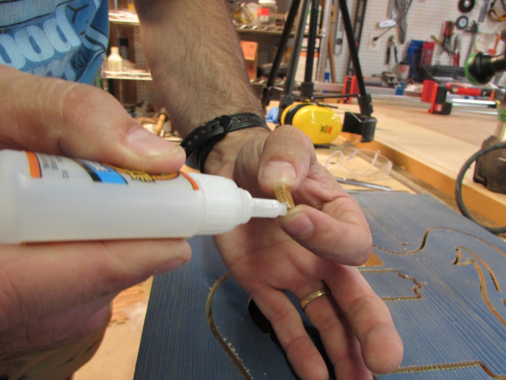 I applied some CA glue to the plug, and pressed it in place. While the glue was setting, but not entirely dry on the outside, I sanded it down flush so the saw dust would embed itself into the hardening glue. This will make it more stainable. I left the waste portion of the carve attached for the sanding so I could rest the sander flat on it.