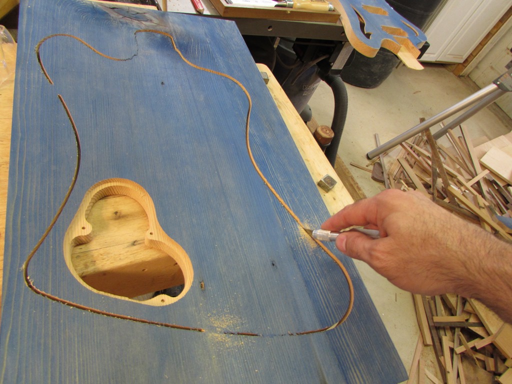 After the dye had cured on my front and rear panels, I loaded the first board into my Carvewright CNC and started the first panel. The back side ran just fine, but I had a problem when I flipped the board and started carving the front. I should have used two tabs to retain the F-holes, but I only used one. The hemlock is a soft wood, and the smaller F-hole blank fell off and caused a problem with the X-axis motion. This effectively stopped the carve, and wouldn’t allow me to restart. When this sort of thing occurs, there are two approaches. The first approach is to chuck the panel and start over, but that would waste wood as well as several hours of carving. Since the Carvewright is fairly accurate when it measures the board, I can start the program again and it usually locates within 1/32″ of where it cut before. To save a few hours of re-carving, I pulled up the software and deleted all the parts that were already carved.