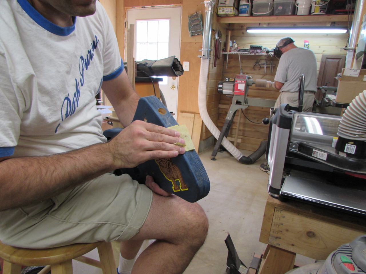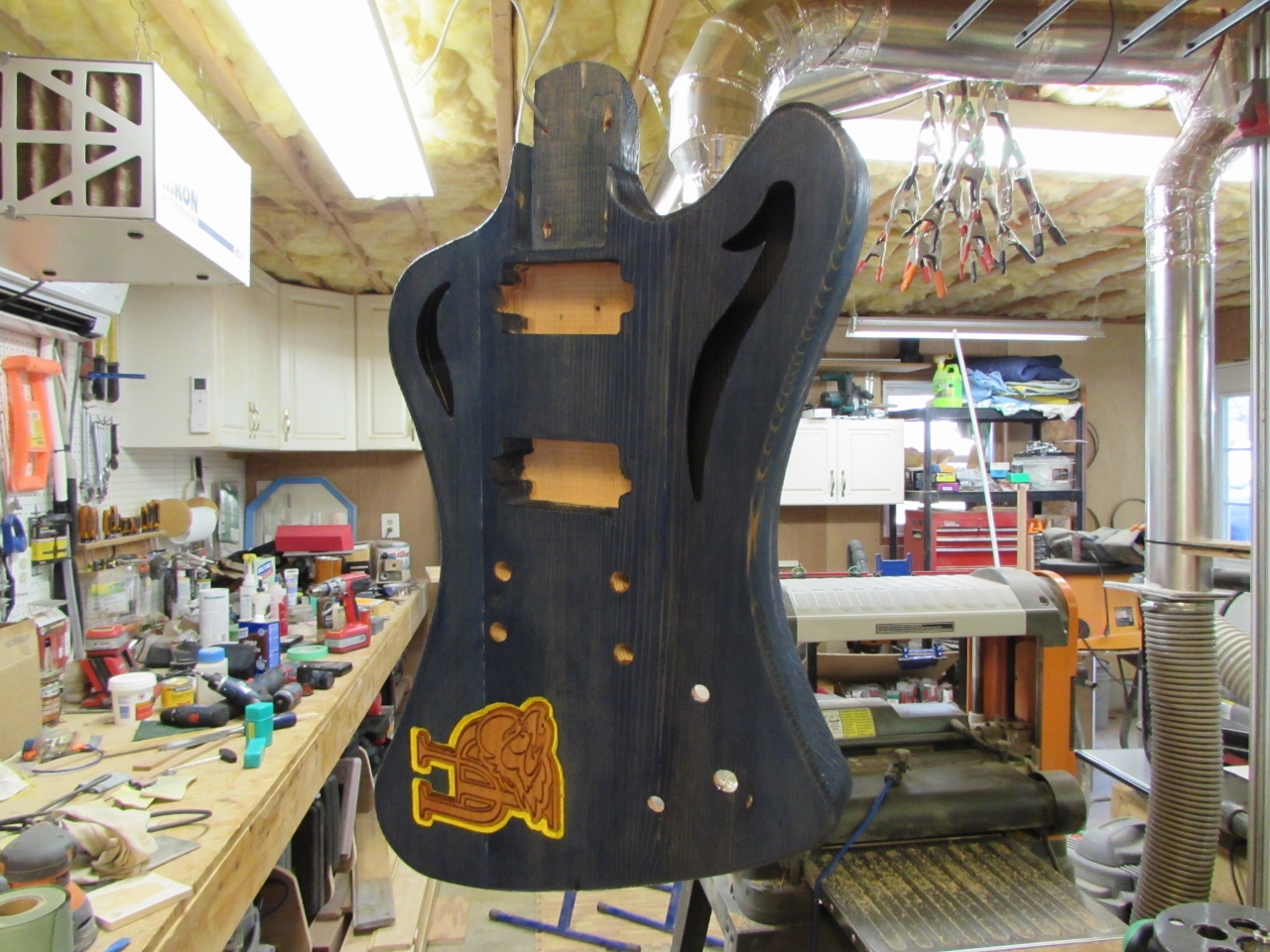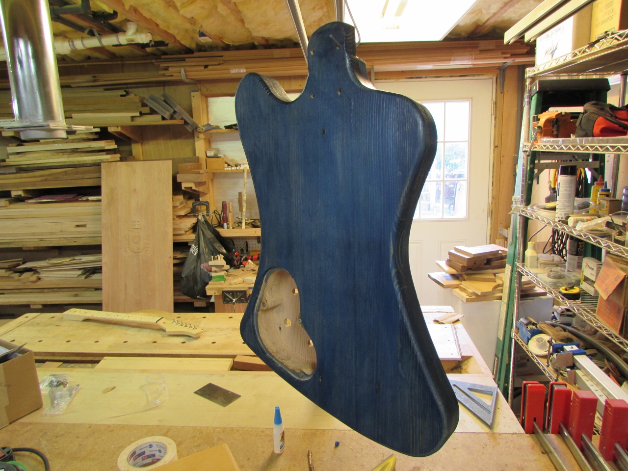 After a liberal coating of oil, I wipe away any excess, paying particular attention to the logo. Oil collects in the grooves and wants to drip and run when I hang it up. I was surprised to notice the combination of the blue dye and the low-gloss oil finish are giving the body a metallic sheen. Its kind of cool.