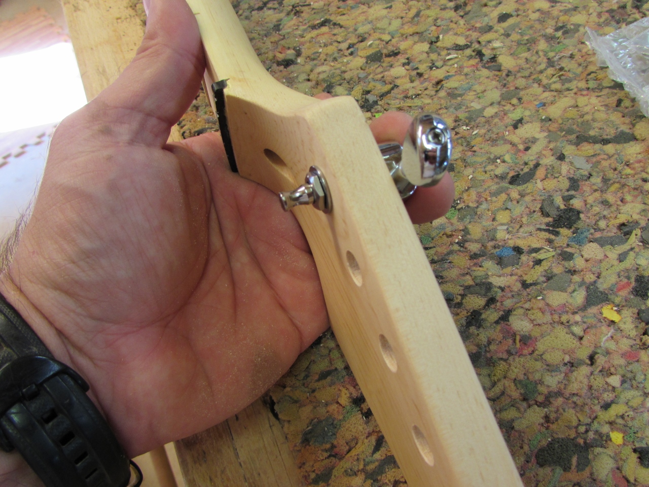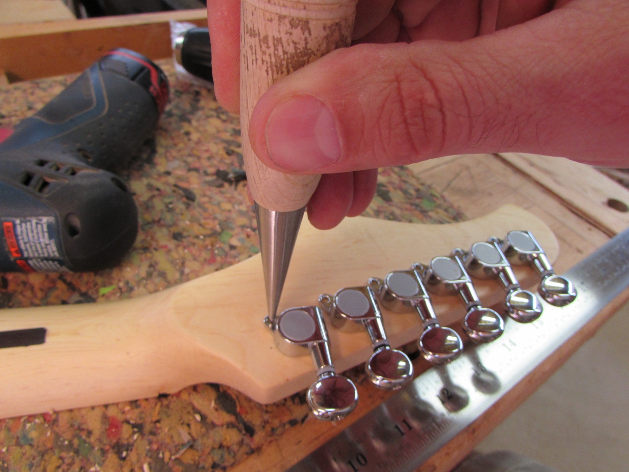 Next challenge was to line them up, making sure to keep the gaps, between the knobs, evenly spaced. I originally lined them up perpendicular to the head, but they seemed too difficult to adjust. I rotated them down so the tuners were offset from each other, and this gave me a bit more room for my fingers. After locating them, I punched a small hole at the screw’s location, with my awl.