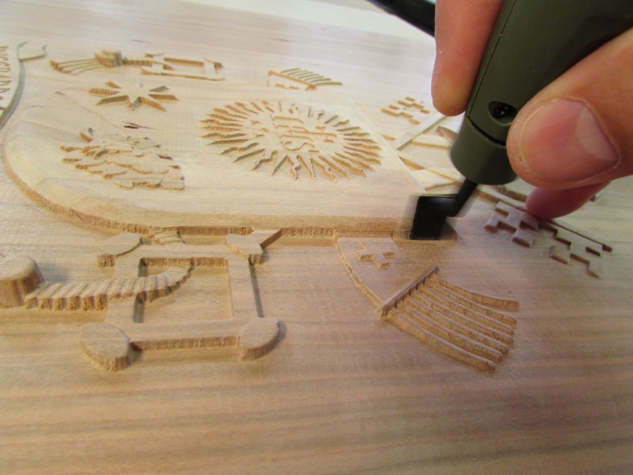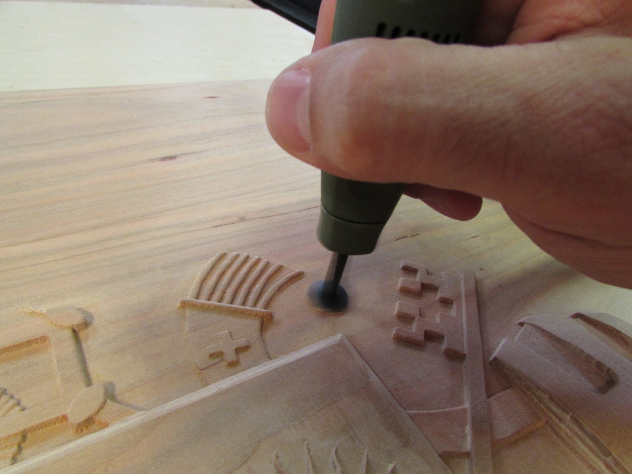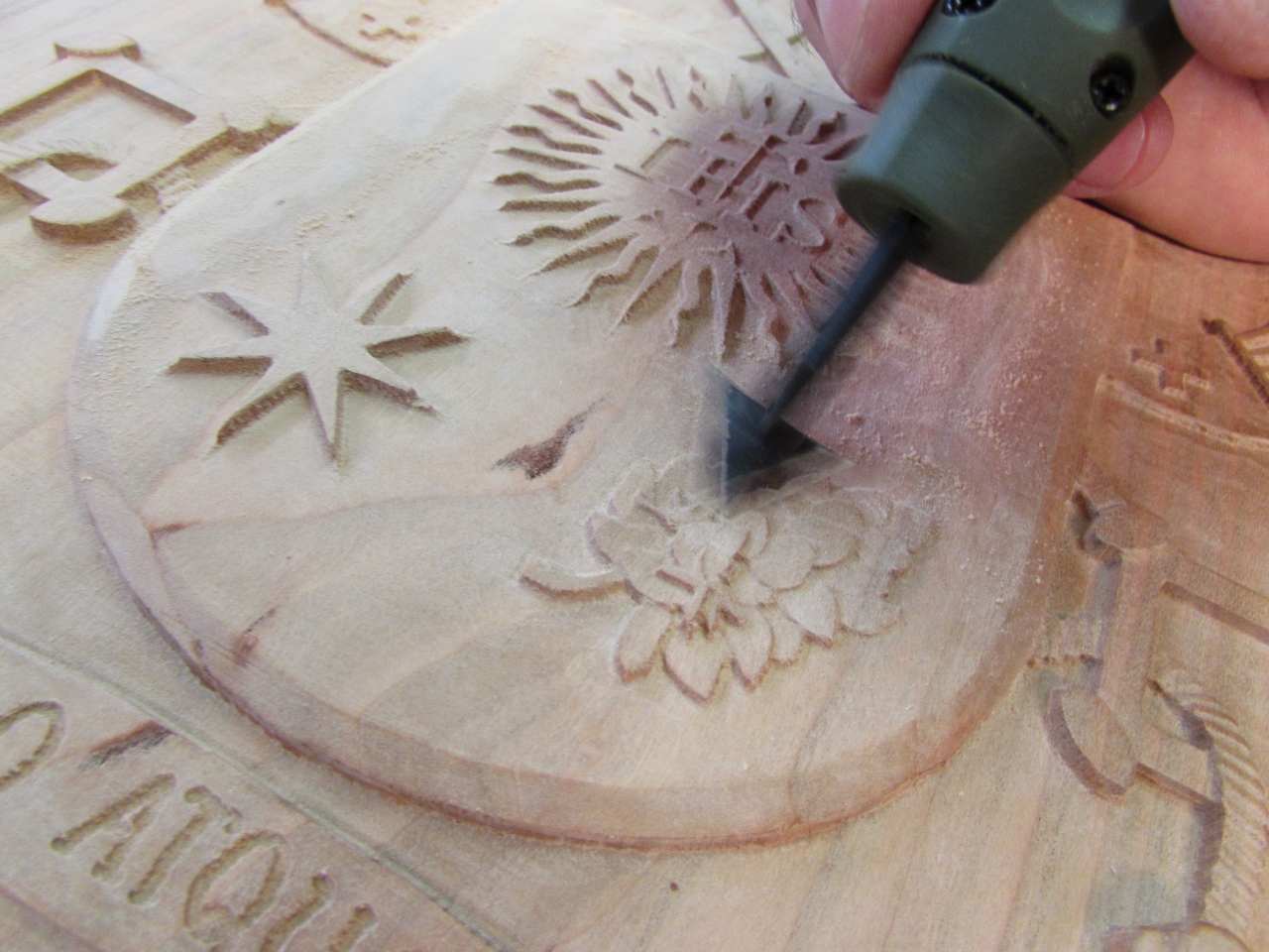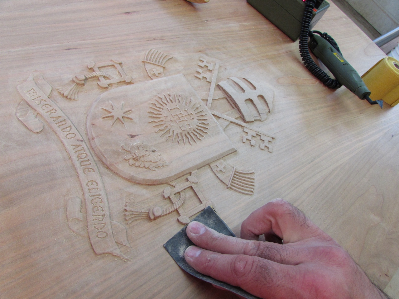 I have been avoiding the hard part of the Papal seal carve. I have to detail sand all of the nooks and crannies. The cut marks that are left behind by my Carvewright CNC router are very shallow, but they show up every 1/32″ over the entire carve. To tackle this problem, I invested in several detail sanding options.