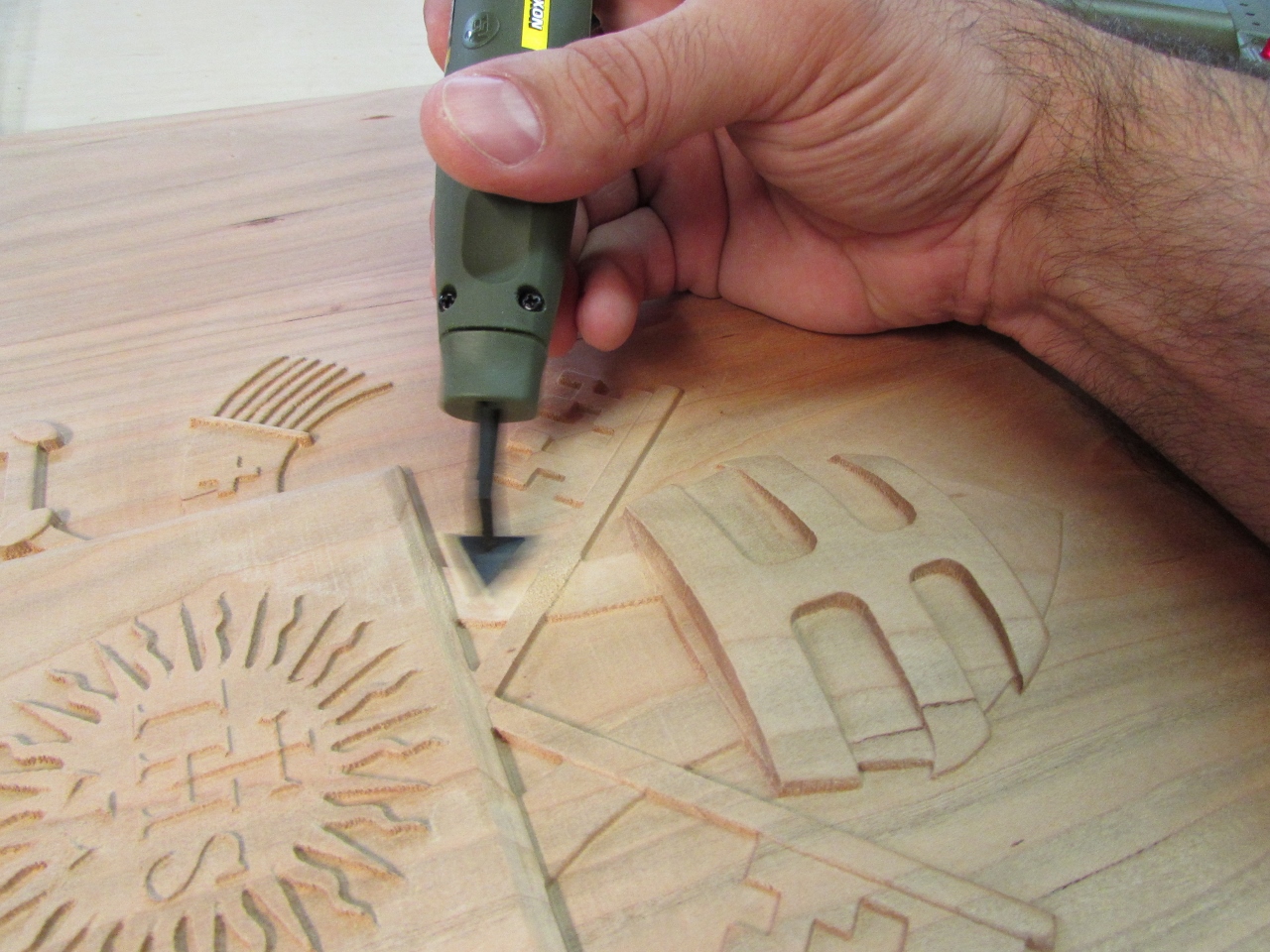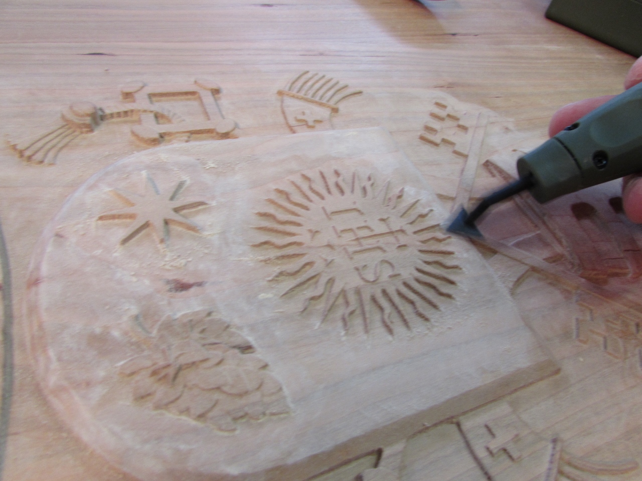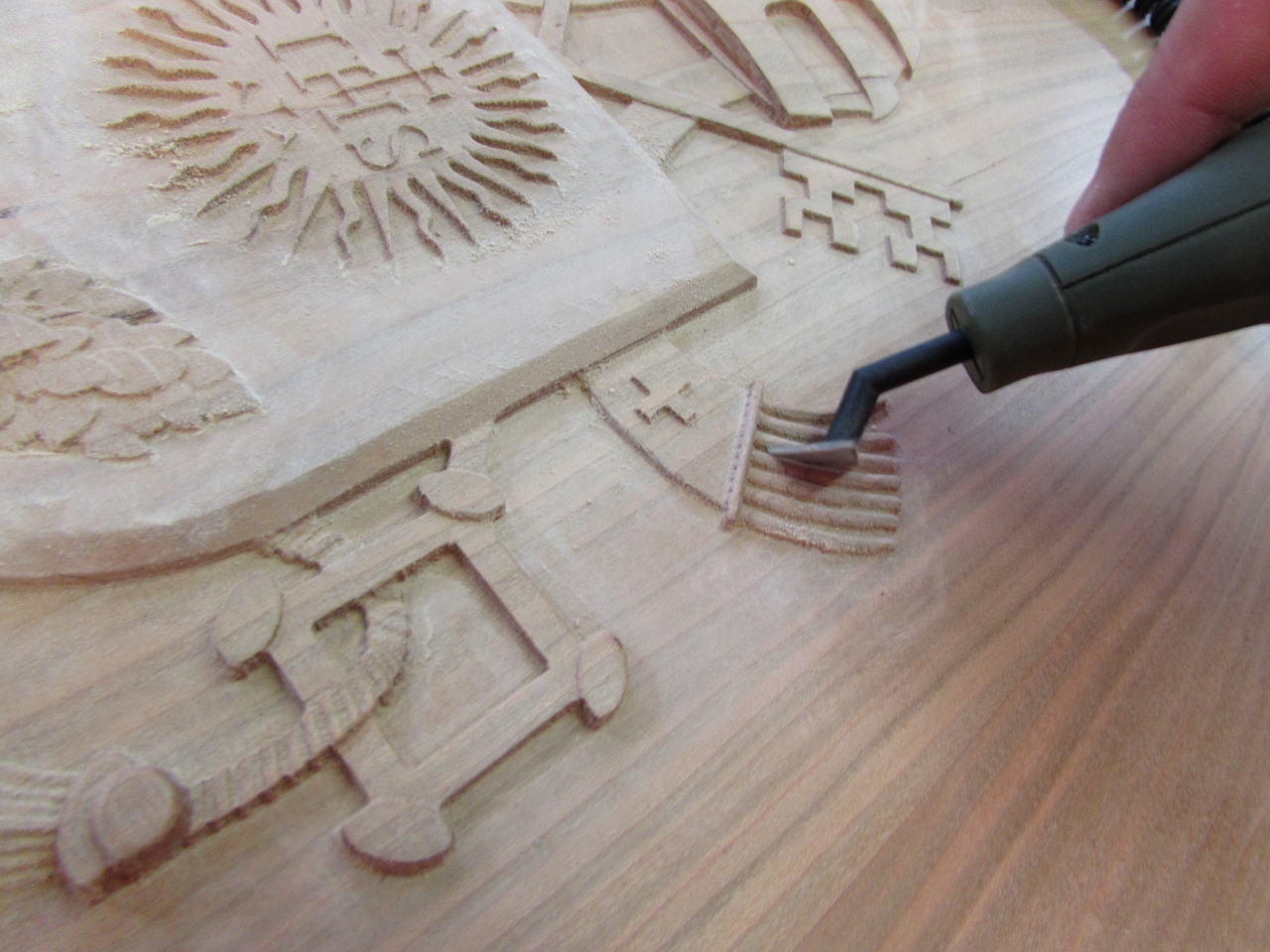 I have been avoiding the hard part of the Papal seal carve. I have to detail sand all of the nooks and crannies. The cut marks that are left behind by my Carvewright CNC router are very shallow, but they show up every 1/32″ over the entire carve. To tackle this problem, I invested in several detail sanding options.